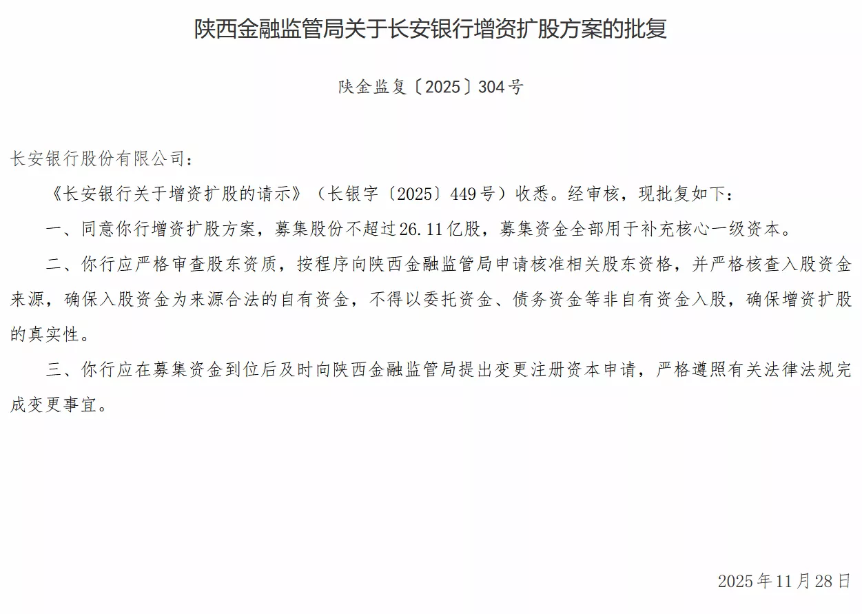 (国家金融监督管理总局) 12月3日,国家金融监督管理总局陕西监管局发布批复,同意长安银行增资扩股方案,募集股份不超过26.11亿股,募集资金全部用于补充核心一级资本。 批复要求,长安银行应严格审查股东资质,按程序向陕西金融监管局申请核准相关股东资格,并严格核查入股资金来源,确保入股资金为来源合法的自有资 金,不得以委托资金、债务资金等非自有资金入股,确保增资扩股的真实性。同时,该行应在募集资金到位后及时向陕西金融监管局提出变更注册资本申 请,严格遵照有关法律法规完成变更事宜。 ...