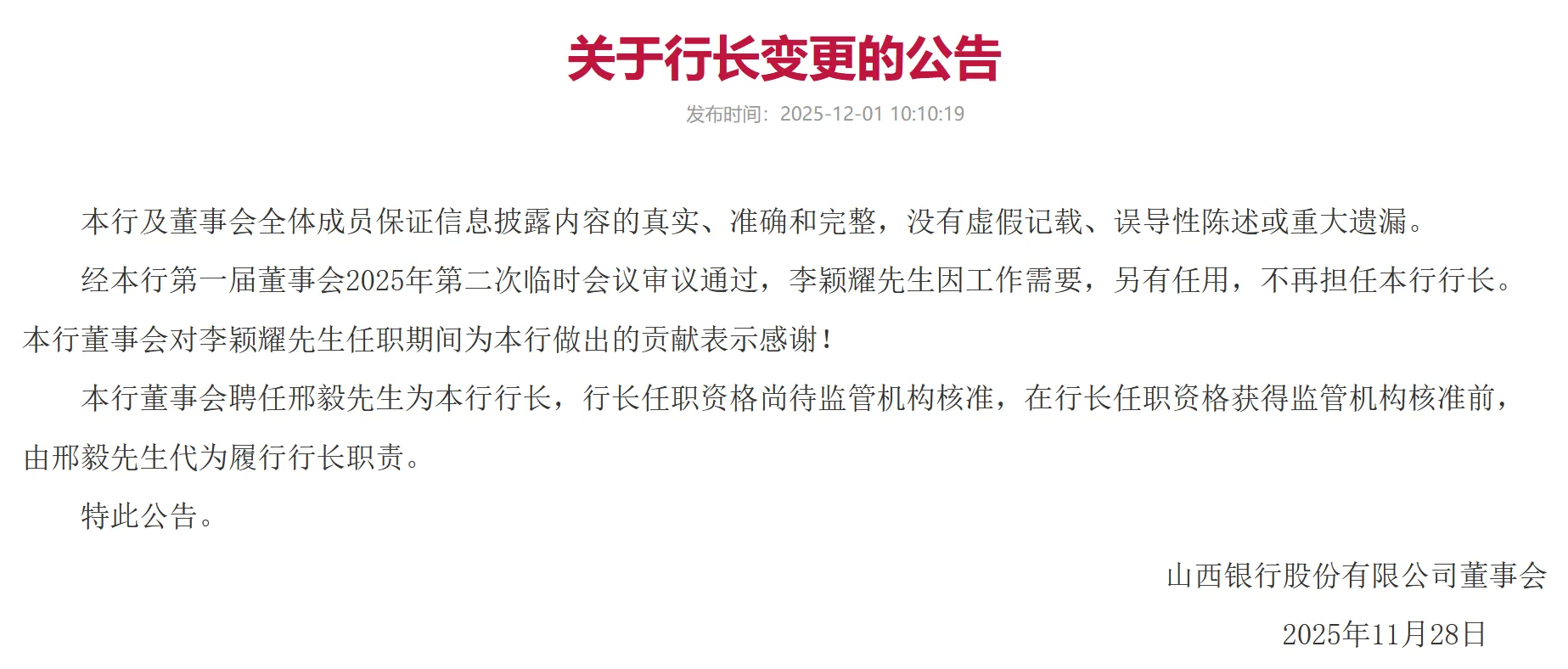 12月1日,山西银行发布关于行长变更的公告,经该行第一届董事会2025年第二次临时会议审议通过,李颖耀因工作需要,另有任用,不再担任该行行长。 山西银行董事会聘任邢毅为该行行长,行长任职资格尚待监管机构核准,在行长任职资格获得监管机构核准前,由邢毅代为履行行长职责。 (山西银行) ...