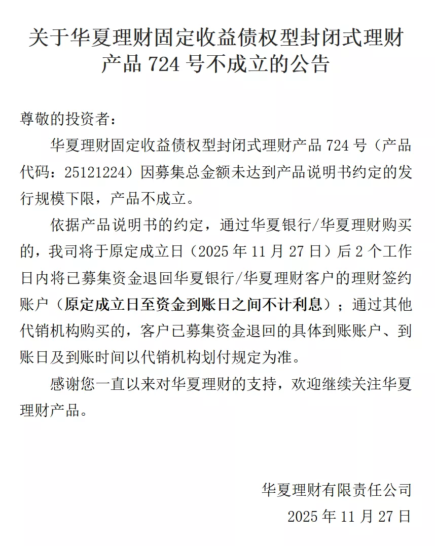 华夏理财固定收益债权型封闭式理财产品724号不成立