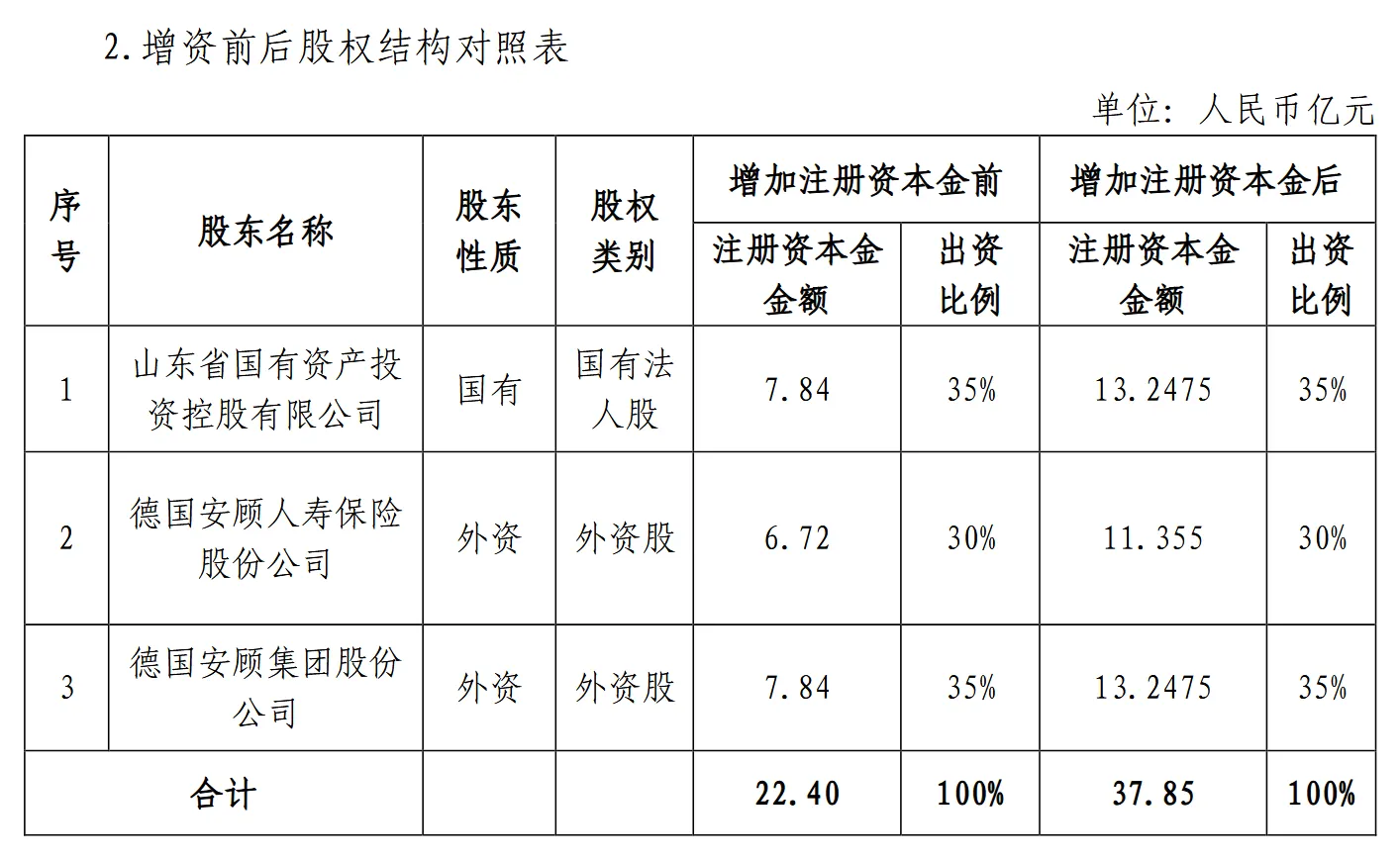 增资完成后,德华安顾人寿注册资本金将由22.40亿元增至37.85亿元。 11月27日,德华安顾人寿发布公告称,该公司于2025年11月14日召开第四届董事会第四十次会议(临时),审议通过了《德华安顾人寿保险有限公司关于增 加公司注册资本金的议案》。 议案内容概述如下:公司股东向德华安顾人寿保险有限公司拟增资15.45亿元人民币,增资后,股东出资比例如下:山东省国有资产投资控股有限公司出资 5.4075亿元,出资比例为35%;德国安顾集团股份公司出资5.4075亿元,出资比例为35%;德国安顾人寿保险股份公司出资4.635亿元,出资比例为30%。 | 府号 | 股东名称 | 股东 性质 | 股权 类别 | 增加注册资本金前 | | 4 141 | | --- | --- | --- | --- | --- | --- | --- | | | | | | 注册资本金 | 出资 | | | | | | | 金额 | 比例 | | | 1 | 山东省国有资产投 资控股有限公司 | 国有 | 国有法 人股 | 7.84 | 35% | | | 2 | 德国安顾人寿保险 股份公司 | 外资 | 外资股 | 6.72 | ...