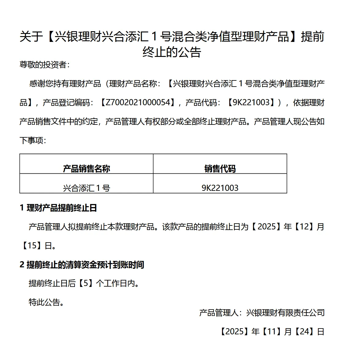 | 产品销售名称 | 销售代码 | | --- | --- | | 兴合添汇 1 号 | 9K221003 | 11月24日,兴银理财发布公告称,依据兴银理财兴合添汇1号混合类净值型理财产品销售文件中的约定,产品管理人有权部分或全部终止理财产品,产品管 理人拟提前终止本款理财产品。该款产品的提前终止日为2025年12月15日。 关于【兴银理财兴合添汇1号混合类净值型理财产品】提前 终止的公告 尊敬的投资者: 感谢您持有理财产品(理财产品名称:【兴银理财兴合添汇 1 号混合类净值型理财产 品】,产品登记编码:【Z7002021000054】,产品代码: 【9K221003】),依据理财 产品销售文件中的约定,产品管理人有权部分或全部终止理财产品。产品管理人现公告如 下事项: 提前终止日后【5】个工作日内。 特此公告。 产品管理人:兴银理财有限责任公司 【2025】年【11】月【24】日 1 理财产品提前终止日 产品管理人拟提前终止本款理财产品。该款产品的提前终止日为【 2025】年【 12】月 【15】日。 2 提前终止的清算资金预计到账时间 ...