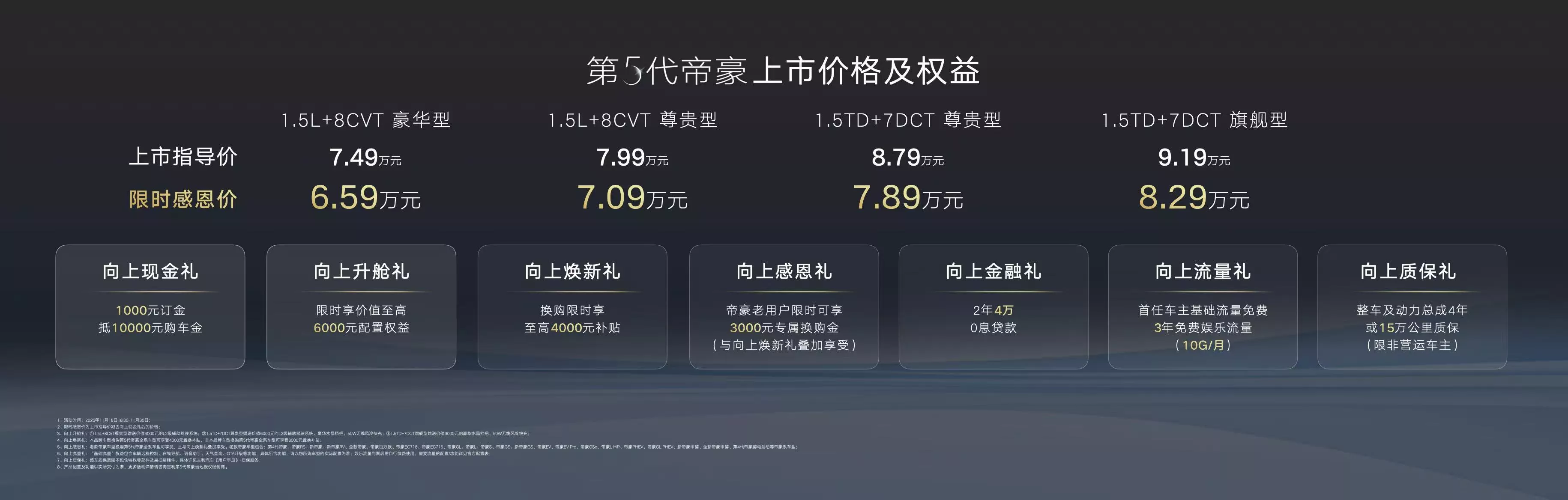 作者丨彭鑫 编辑丨安安 11月18日,第5代帝豪全球上市发布会于杭州启幕,新车共推出四款配置,限时感恩价6.59-8.29万元。 第5代帝豪首次将包含行车、泊车、安全三大维度的高阶辅助驾驶系统带入8万级燃油车型,拥有最高支持120km/h刹停的AEB急刹避险功能和同级唯一AES 主动紧急避让功能。作为首款基于新一代BMA Evo全球模块化架构打造的全新车型,第5代帝豪在颜值、舒享、安全、驾控、智能五大维度实现全面进阶。 外观方面,前脸搭载12根镀铬纵向直瀑立柱,"吉目远眺LED前大灯"拥有超170米照射距离,将豪华车型的灯光安全标准引入A级市场,显著提升夜间行车 视野。车身侧面以0.618黄金比例腰线与2.2倍轮高比勾勒灵动姿态,配合1885mm同级最宽车身、1.27宽高比、18英寸五星之盾轮毂及544mm超低重心。车尾 配备LED超红光尾灯,采用豪华车同款波长627-632nm超红光LED,具备300米超远穿透力,恶劣天气下穿透性能提升30%。车身配色从万里山河中汲取灵 感,推出千山青、墨岩黑、峰芒银、云纱白、松壑蓝、苍烟灰六款国风色彩。 内饰方面,大面积软质包覆搭配精致镀铬饰条,触感与质感全面越级。首搭水 ...