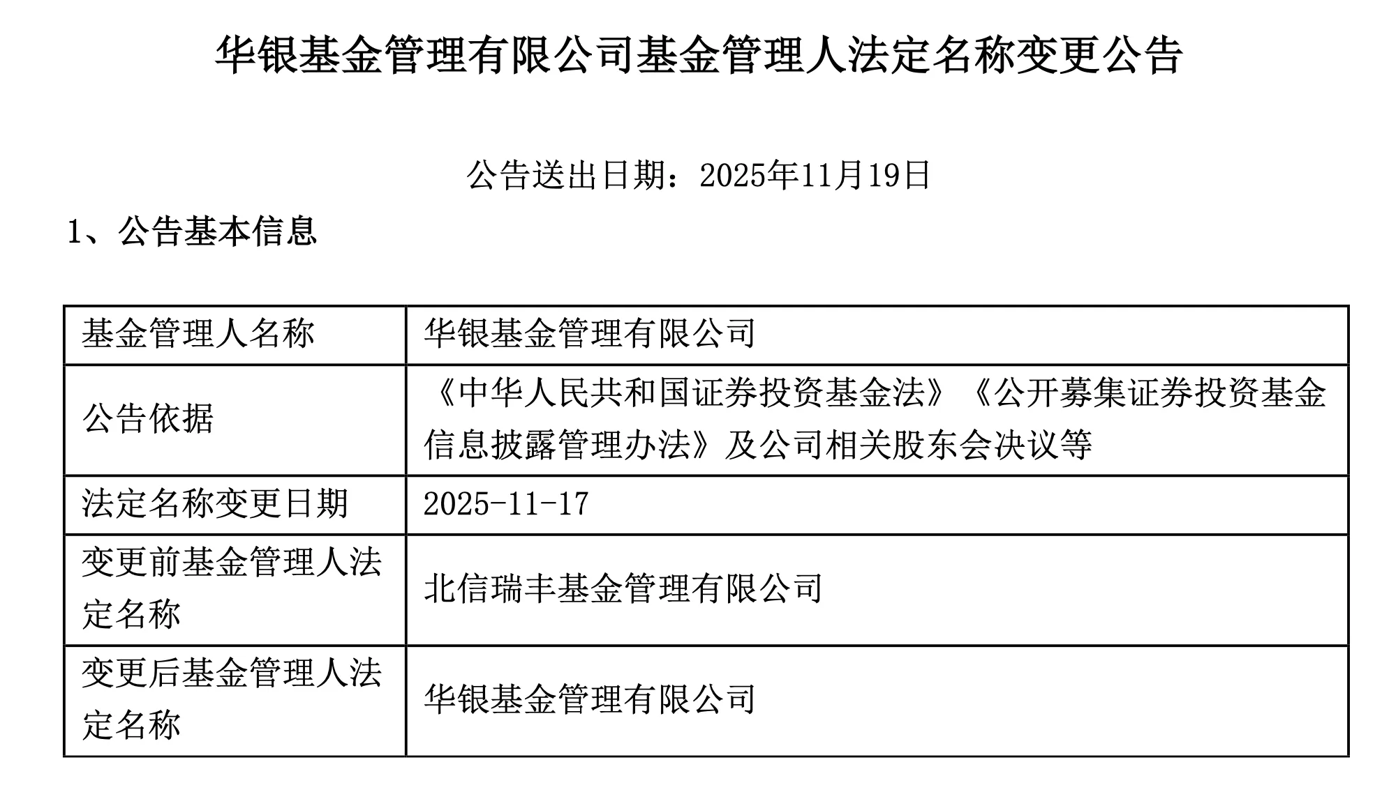 11月19日,原北信瑞丰基金发布更名公告显示,自11月17日起,该公司名称由此前的"北信瑞丰基金管理有限公司"变更为"华银基金管理有限公司"。 | 基金管理人名称 | 华银基金管理有限公司 | | --- | --- | | 公告依据 | 《中华人民共和国证券: 信息披露管理办法》及: | | 法定名称变更日期 | 2025-11-17 | | 变更前基金管理人法 定名称 | 北信瑞丰基金管理有限: | | 变更后基金管理人法 | | | 定名称 | 华银基金管理有限公司 | 公告显示,公司名称变更已完成工商变更登记手续,公司后续将对旗下公募基金产品名称进行相应变更。公司将按照相关法律法规的规定,向中国证监会申 请更换经营证券期货业务许可证。公司名称变更后,法律主体和对外法律关系不变,原以"北信瑞丰基金管理有限公司"名义签署的合同及法律文件的条款、 效力及履行均不受影响。 公开资料显示,华银基金成立于2014年3月17日,是经中国证监会批准设立,由北京国际信托有限公司与莱州瑞海投资有限公司共同发起设立的基金管理公 司,两者分别持股60%和40%。公司注册资本为1.7亿元,主要业务涵盖基金募集、销售及资产管理等 ...
