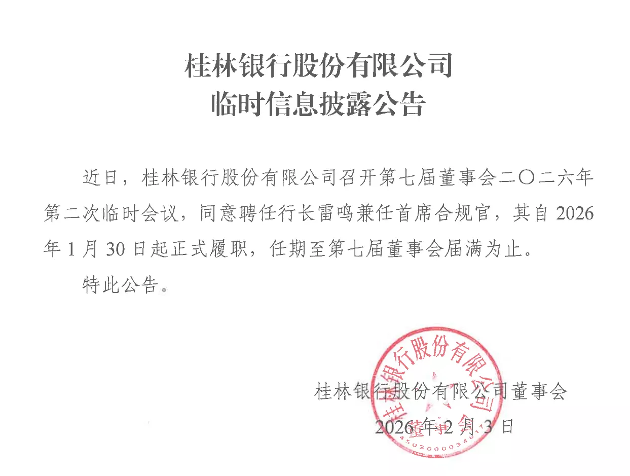 2月3日,桂林银行发布公告称,近日该行召开第七届董事会2026年第二次临时会议,同意聘任行长雷鸣兼任首席合规官,其自2026年1月30日起正式履职,任期至第七届董事会届 满为止。 (桂林银行) ...