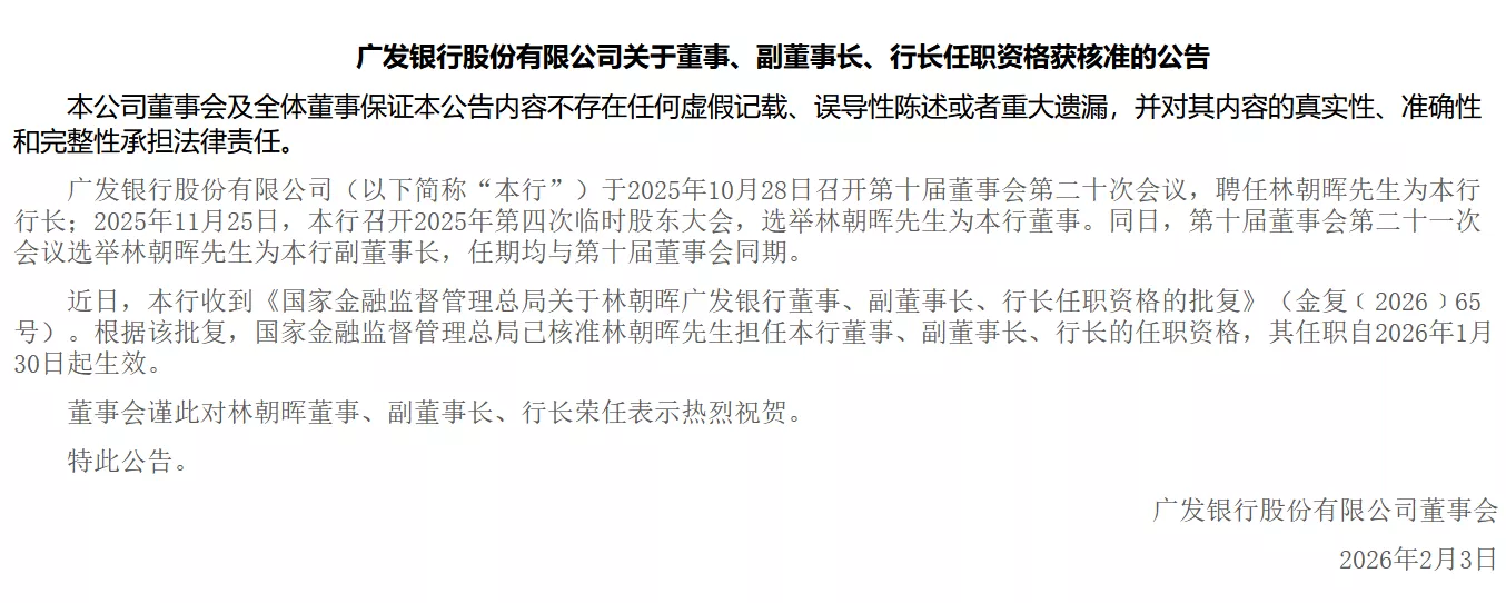 2月3日,广发银行发布公告称,该行于2025年10月28日召开第十届董事会第二十次会议,聘任林朝晖为行长;2025年11月25日,广发银行召开2025年第四次 临时股东大会,选举林朝晖为董事。同日,第十届董事会第二十一次会议选举林朝晖为董事长,任期均与第十届董事会同期。 近日,广发银行收到《国家金融监督管理总局关于林朝晖广发银行董事、副董事长、行长任职资格的批复》(金复﹝2026﹞65号)。根据该批复,国家金融 监督管理总局已核准林朝晖担任该行董事、副董事长、行长的任职资格,其任职自2026年1月30日起生效。 ...