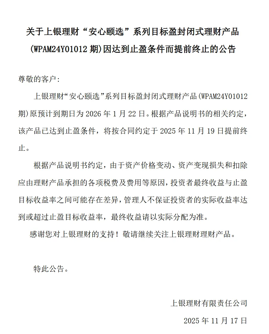 11月17日,上银理财发布公告称,该公司发行的"安心颐选"系列目标盈封闭式理财产品(WPAM24Y01012期)原预计到期日为 2026年1月22日。根据产品说明书的相关约定,该产品已达到止盈条件,将按合同约定于2025年11月19日提前终止。 (上银理财) ...