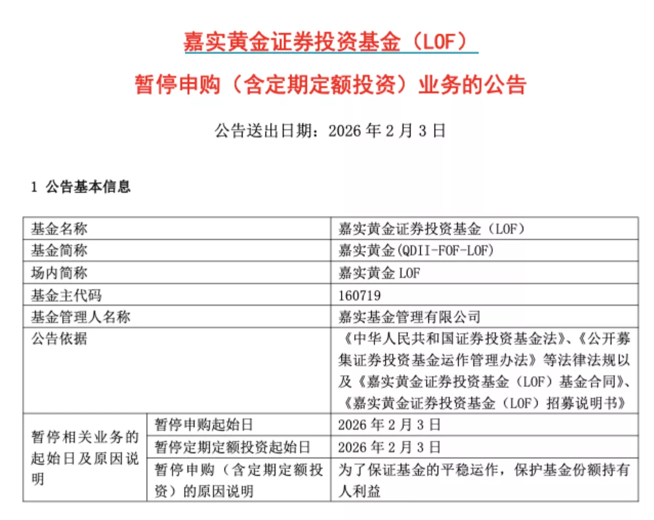 | 基金名称 | | 嘉实黄金证券投资基金(LOF) | | --- | --- | --- | | 基金简称 | | 嘉实黄金(QDII-FOF-LOF) | | 场内简称 | | 嘉实黄金 LOF | | 基金主代码 | | 160719 | | 基金管理人名称 | | 嘉实基金管理有限公司 | | 公告依据 | | 《中华人民共和国证券投资基金法》 集证券投资基金运作管理办法》等 及《嘉实黄金证券投资基金(LOF): 《嘉实黄金证券投资基金(LOF)招 | | 暂停相关业务的 | 暂停申购起始日 | 2026年2月3日 | | 起始日及原因说 | 暂停定期定额投资起始日 | 2026年2月3日 | | 明 | 暂停申购(含定期定额投 | 为了保证基金的平稳运作,保护基: | | | 资)的原因说明 | 人利益 | (基金公告) 暂停期间不影响赎回业务的正常办理,投资者仍可进行赎回操作。 恢复申购及定投业务的时间将另行公告,目前未明确具体恢复日期。 嘉实基金管理有限公司发布公告,嘉实黄金证券投资基金(LOF)自2026年2月3日起暂停申购及定期定额投资业务,原因是基金管理人嘉实基金管理有限公 司为保障基金 ...