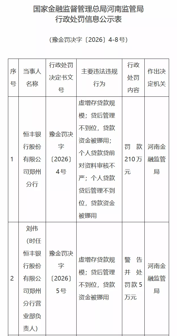 1月28日,国家金融监督管理总局河南监管局披露的行政处罚信息显示,恒丰银行股份有限公司郑州分 行因存在以下主要违法违规行为:虚增存贷款规模;贷后管理不到位,贷款资金被挪用;个人贷款贷前 对资料审核不严;个人贷款贷后管理不到位,贷款资金被挪用,被罚款210万元。 同时,时任恒丰银行股份郑州分行营业部负责人刘伟、郑州自贸区支行负责人杨华、郑州分行业务九部 负责人郭辉均被警告并处罚款5万元,时任恒丰银行郑州分行普惠金融部负责人乔娜被警告。 | 序 | 当事人 | 行政处罚 | 主要违法违规 | 行政 | 作出决 | | --- | --- | --- | --- | --- | --- | | 들 | 名称 | 决定书文 | 行为 | 处罚 | 定机关 | | | | 号 | 虚增存贷款规 | 内容 | | | | 恒丰银 | 豫金罚决 | 模:贷后管理 不到位,贷款 | | | | | | | 资金被挪用; | | | | | 行股份 | 字 | | 罚 款 | 河南金 | | 1 | 有限公 | (2026) | 个人贷款贷前 | 210万 | 融监管 | | | | | 对资料审核不 | | | | | 司郑 ...