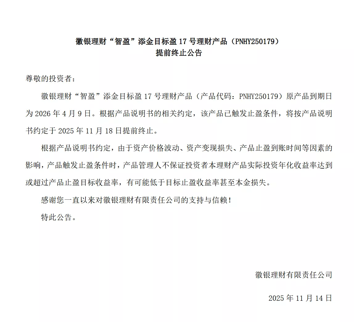 徽银理财:触发止盈条件,“智盈”添金目标盈17号理财产品提前终止