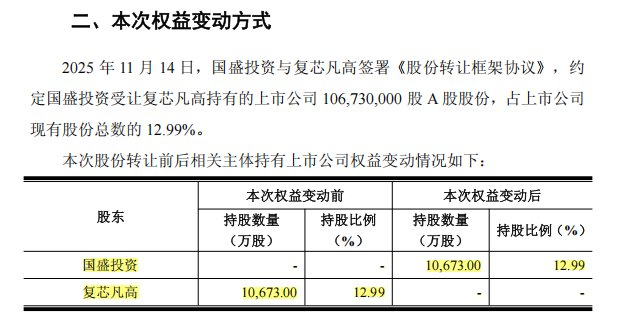 Core Viewpoint - Shanghai Guosheng Group plans to acquire a 12.99% stake in Fudan Microelectronics through a share transfer from Fudan Microelectronics' largest shareholder, Fuxin Vango, for a total consideration of 5.144 billion yuan, which is approximately 15% lower than the previous closing price [1][2]. Group 1 - The transaction involves the transfer of 106.73 million A-shares at a price of 48.20 yuan per share, resulting in Guosheng Investment becoming the largest shareholder of Fudan Microelectronics [1][3]. - Following the transaction, Fuxin Vango will no longer hold any shares in Fudan Microelectronics, and the company will maintain its status of having no controlling shareholder or actual controller [1][2]. - Fudan Microelectronics stated that the transaction will not significantly impact its management or operations and does not involve a takeover bid [1][2]. Group 2 - Fudan University will continue to support Fudan Microelectronics in strategic cooperation and collaborative research and development efforts after the share transfer [2]. - Guosheng Investment's parent company, Guosheng Group, is controlled by the Shanghai State-owned Assets Supervision and Administration Commission, and it holds over 5% stakes in nine other listed companies [2][4]. - The report details Guosheng Group's significant holdings in various companies, including 19.87% in Hu Silicon Industry and 28.11% in Shanghai Jianke [4].