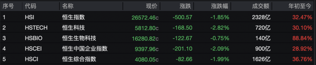 Market Overview - On November 14, Hong Kong's three major indices collectively declined, with the Hang Seng Index closing at 26,572.46 points, down 1.85% [1] - The Hang Seng Tech Index fell by 2.82% to 5,812.80 points, while the Hang Seng China Enterprises Index dropped 2.09% to 9,397.96 points [1][2] - The total market turnover was HKD 232.8 billion, with net inflows from southbound funds amounting to HKD 12.887 billion [1] Stock Performance - Major tech stocks experienced significant declines, with Baidu Group-SW down 7.21% to HKD 117.1 per share, JD Group-SW down 6.03% to HKD 116.9, and Alibaba-W down 4.38% to HKD 154.9 [2] - The Hong Kong Stock Exchange fell by 2.61%, and China Life dropped 3.25%, indicating a broader downturn in the market [3] Specific Company Updates - Xiaoma Zhixing-W saw a substantial drop of 13.89%, closing at HKD 93.00 per share, with a cumulative decline of over 30% since its IPO [5] - Tencent Holdings fell by 2.29%, despite Goldman Sachs maintaining a positive outlook on its third-quarter performance, citing the fastest revenue growth in four years [8] - JD Health rose 6.59%, driven by strong revenue growth of 28.7% year-on-year in Q3 2025, surpassing market expectations [10] Analyst Insights - UBS maintains an overweight position on China within emerging markets, highlighting the early stage of the tech/AI cycle and the favorable microeconomic conditions [11][13] - UBS emphasizes that companies benefiting from AI demand and those with low leverage and reasonable valuations are well-positioned for growth [12]