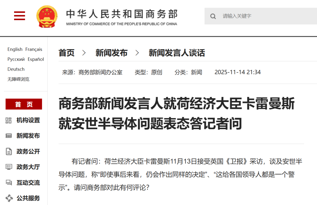 【导读】商务部:中方对荷兰经济大臣卡雷曼斯言论表示极度失望和强烈不满 事关安世半导体,商务部最新发声! 11月14日晚间,商务部官网显示,商务部新闻发言人就荷经济大臣卡雷曼斯就安世半导体问题表态答记者问。 有记者问:荷兰经济大臣卡雷曼斯11月13日接受英国《卫报》采访,谈及安世半导体问题,称"即使事后来看,仍会作出同样的决定""这给各国领导人都 是一个警示"。请问商务部对此有何评论? 答:中方注意到荷兰经济大臣卡雷曼斯近日接受媒体采访的相关言论。中方对这种混淆是非、颠倒黑白、一意孤行的言论表示极度失望和强烈不满。这场 半导体供应链危机带给全世界的深刻教训是,不能强行用行政手段不当干预企业经营。在荷兰政府9月30日发布行政令以及10月8日荷企业法庭作出错误判 决之前,全球半导体产供链是稳定和安全的。但荷方强行不当干预,并托管一个100%控股的私营企业99%的股份,这种违背契约精神、不明智冲动的行 径一石激起千层浪,才是造成全球半导体产供链动荡和混乱的恶源。 采访显示,仅仅凭借某些人去大臣办公室谈话,就引用冷战时期制定但从未启用的《货物可用性法案》,匆忙出台部长行政令,并推动法院在极短时间内 作出裁决。这种做法既 ...