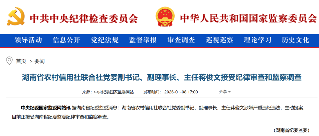 【导读】湖南省农村信用社联合社党委副书记、副理事长、主任蒋俊文接受纪律审查和监察调查 金融反腐最新通报来了! 公开信息显示,蒋俊文出生于1970年2月,湖南湘阴人,中共党员,工学硕士,工程师。 蒋俊文早期曾在建设银行株洲分行工作多年。2003年,蒋俊文离开建行株洲分行,调任株洲市石峰区副区长。2005年,蒋俊文回归银行业,出任株洲市商 业银行行长。 2011年,株洲市商业银行与湘潭市商业银行、衡阳市商业银行等地方银行合并重组,成立华融湘江银行(现湖南银行),株洲市商业银行更名为华融湘江 银行株洲分行。蒋俊文继续担任该分行行长,后进入华融湘江银行总行担任副行长。 华融湘江银行定期报告显示,2014年8月,该行董事会聘任蒋俊文为常务副行长;2016年3月,蒋俊文行长任职资格获监管核准。2021年,华融湘江银行董 事会继续聘任蒋俊文为行长。 1月8日,中央纪委国家监委官网通报:湖南省农村信用社联合社党委副书记、副理事长、主任蒋俊文涉嫌严重违纪违法,主动投案,目前正接受湖南省纪 委监委纪律审查和监察调查。 2022年,中国华融退出华融湘江银行,蒋俊文辞去该行董事、董事会风险管理委员会主任委员、行长职务。 2024年1 ...