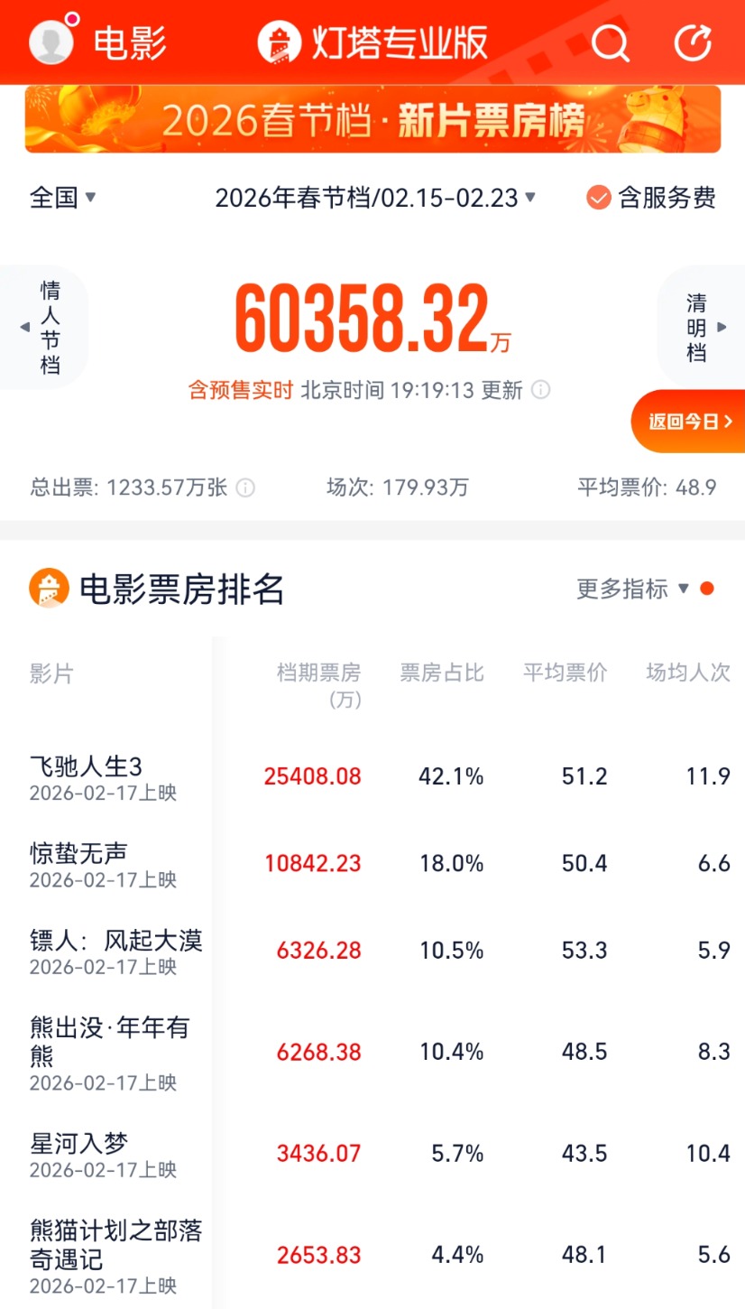 【导读】春节档总票房突破6亿元,《飞驰人生3》超2.5亿元,《惊蛰无声》超1亿元 中国基金报晨曦综合整理 2026年春节档,最新票房数据来了! 值得一提的是,该影片约90%的场景取景于深圳,呈现出一幅"银幕之内是故事,银幕之外是深圳"的深度城市叙事画 卷。《惊蛰无声》的上映不仅是一场电影盛事,更是深圳城市形象的一次全新展示。 预售票房排在第三位的是由同名漫画改编、袁和平执导的《镖人:风起大漠》,截至发稿票房超6300万元。 2月16日晚间,灯塔专业版数据显示,2026年春节档票房(含预售)已突破6亿元。 | FAST AT IT AND STEN | 0320.40 | 1U.570 | 55.5 | 3.7 | | --- | --- | --- | --- | --- | | 2026-02-17上映 | | | | | | 熊出没·年年有 熊 | 6268.38 | 10.4% | 48.5 | 8.3 | | 2026-02-17上映 | | | | | | 星河入梦 | 3436.07 | 5.7% | 43.5 | 10.4 | | 2026-02-17上映 | | | | | | 熊猫计划之部落 ...