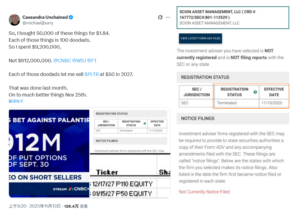 数天前引发美股暴跌的知名"大空头"迈克尔·贝瑞(Michael Burry),今日宣布他管理的Scion基金已经从美国证券交易委员会撤销注册。 同时,贝瑞还在社交平台上表示,所谓"9.12亿美元做空"不过是媒体的数学错误——他真实投入的资金只有920万美元。 与此同时,SEC文件显示其旗下Scion Asset Management已于11月10日终止注册。 披露做空细节 否认"十亿美元"做空传闻 11月初,贝瑞管理的Scion基金公布13F监管文件,显示其分别持有两大明星AI公司Palantir、英伟达的看跌期权。他还在社交媒体上屡次发言,认为市场正 处于泡沫状态,并指责科技巨头偷偷拉长算力芯片的折旧时间,从而降低大规模投资对利润表的影响。 彼时,有媒体报道他"十亿美元做空"Palantir、英伟达,这引发了美国科技股的全面下挫。 贝瑞亲自辟谣并披露了持仓细节。他提供的截图显示,他持有5万张Palantir 2027年1月15日到期、行权价50美元的看跌期权,相当于500万股。他同时解释 称,他购买的价格是1.84美元,所以购买这些期权总共花了920万美元。这一交易已经在10月交割完成。 另外,他还持有1万 ...