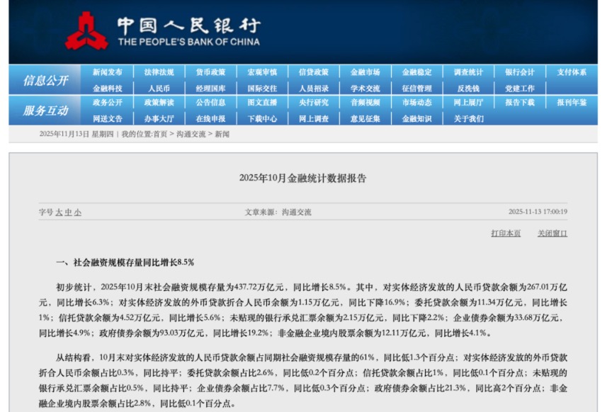 Core Viewpoint - The People's Bank of China (PBOC) has reported that M2 and social financing growth rates remain high, creating a favorable monetary environment for economic recovery. The current monetary policy stance is supportive, aiming to promote reasonable price recovery and maintain strong support for the real economy [1][12]. Monetary Supply and Financing - As of October 2025, the M2 balance reached 335.13 trillion yuan, with a year-on-year growth of 8.2% [4]. - The social financing scale stood at 437.72 trillion yuan, reflecting a year-on-year increase of 8.5% [5]. - From January to October, the incremental social financing was 30.9 trillion yuan, which is 3.83 trillion yuan more than the same period last year [6]. - The balance of various loans in renminbi was 270.61 trillion yuan at the end of October, showing a year-on-year growth of 6.5% [7]. Loan Rates and Structure - The average interest rate for newly issued corporate loans (in both domestic and foreign currencies) in October was 3.1%, approximately 40 basis points lower than the same period last year [7]. - The structure of loans is continuously optimizing, with inclusive small and micro loans growing by 11.6% year-on-year, and medium to long-term loans for the manufacturing sector increasing by 7.9% [11]. Government Bonds and Financing Channels - The issuance of government bonds and special refinancing bonds has accelerated, significantly supporting the growth of social financing. In 2025, the issuance of ultra-long special government bonds increased from 1 trillion yuan to 1.3 trillion yuan [8]. - The financial system has become more diversified, with enterprises increasingly utilizing bonds and stocks for financing rather than relying solely on bank loans [8]. Economic Indicators and Price Trends - The Consumer Price Index (CPI) turned positive in October, rising by 0.2% year-on-year, while the core CPI (excluding food and energy) increased by 1.2%, marking the highest growth since March 2024 [12]. - The Producer Price Index (PPI) decreased by 2.1% year-on-year, with the rate of decline narrowing for three consecutive months [12]. Future Monetary Policy Outlook - The current monetary policy is deemed supportive, with expectations for continued implementation of moderately loose monetary policies to maintain strong support for the real economy [12].