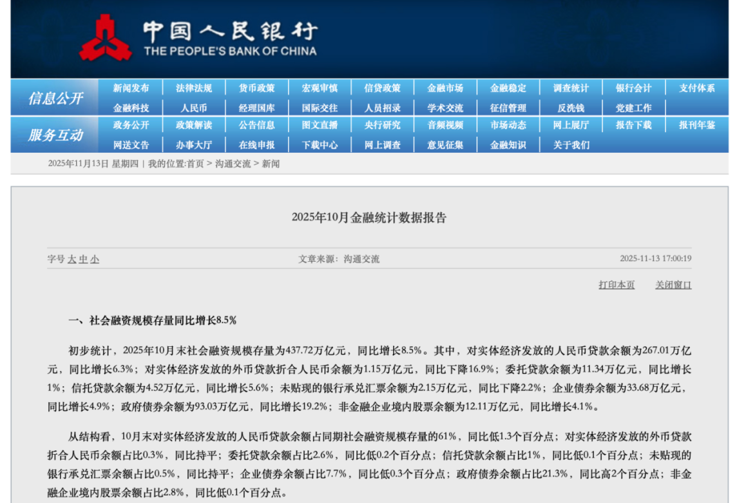 Core Insights - The central bank's October financial data indicates that M2 and social financing growth rates remain high, supporting economic recovery [1][4] - Loan growth is reasonable, with an optimized credit structure and low loan interest rates [1][4] Monetary Policy - Current monetary policy stance is supportive, creating a conducive environment for reasonable price recovery [1][10] - Future implementation of moderately loose monetary policy is necessary to maintain strong support for the real economy [1][10] Financial Data Highlights - As of October 2025, M2 balance reached 335.13 trillion yuan, with a year-on-year growth of 8.2% [4][6] - Social financing stock was 437.72 trillion yuan, growing 8.5% year-on-year [4][5] - From January to October, the increment in social financing was 30.9 trillion yuan, exceeding last year's figure by 3.83 trillion yuan [4][5] - By the end of October, the balance of RMB loans was 270.61 trillion yuan, with a year-on-year increase of 6.5% [4][8] Credit Structure - The structure of loans continues to improve, with inclusive small and micro loans growing by 11.6% and medium to long-term loans for manufacturing increasing by 7.9% [8][9] - The growth of loans related to new economic drivers indicates a shift towards high-quality development [8][9] Government Bonds and Financing - Rapid issuance of government bonds and high demand for corporate bonds have significantly supported the growth of social financing [5] - The issuance of special long-term government bonds increased from 1 trillion yuan last year to 1.3 trillion yuan this year, reflecting fiscal support for economic growth [5] Price Trends - Consumer Price Index (CPI) turned positive in October, indicating a 0.2% year-on-year increase, while core CPI rose by 1.2% [10] - Producer Price Index (PPI) decreased by 2.1%, with the rate of decline narrowing for three consecutive months [10]