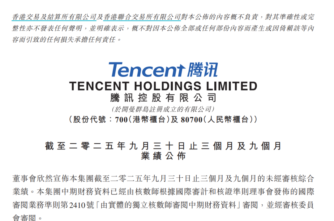 Group 1: Financial Performance - The company's Q3 revenue reached RMB 192.87 billion, exceeding market expectations of RMB 188.8 billion, with a net profit of RMB 63.13 billion, significantly surpassing the forecast of RMB 55.88 billion, showing a quarter-on-quarter increase of 13% and a year-on-year increase of 19% [2][4]. - Basic earnings per share increased by 21% year-on-year to RMB 6.95, while diluted earnings per share rose by 20% to RMB 6.78 [4][10]. Group 2: Business Segments - Value-added services revenue grew by 16% year-on-year to RMB 95.86 billion, with domestic game revenue at RMB 42.8 billion, up 15%, and international game revenue at RMB 20.8 billion, up 43% [5][11]. - Marketing services revenue increased by 21% year-on-year to RMB 36.24 billion, driven by higher ad exposure and AI-driven ad targeting [5][8]. - Financial technology and enterprise services revenue rose by 10% year-on-year to RMB 58.17 billion, benefiting from increased commercial payment activities and consumer loan services [5][8]. Group 3: User Engagement - As of September 30, 2025, the combined monthly active accounts for WeChat reached 1.414 billion, a 2% increase year-on-year, while QQ's mobile monthly active accounts decreased by 8% to 517 million [9][10]. - The number of paid value-added service subscribers remained stable at 265 million [10]. Group 4: AI Developments - General and administrative expenses increased by 18% year-on-year to RMB 34.2 billion, primarily due to increased R&D spending, especially on AI initiatives [12]. - The company has enhanced its AI capabilities, leading to improved advertising targeting and user engagement in gaming and other sectors [12][13]. Group 5: Executive Insights - The CEO highlighted solid revenue and profit growth in Q3 2025, reflecting healthy trends in gaming, marketing services, and financial technology [13].