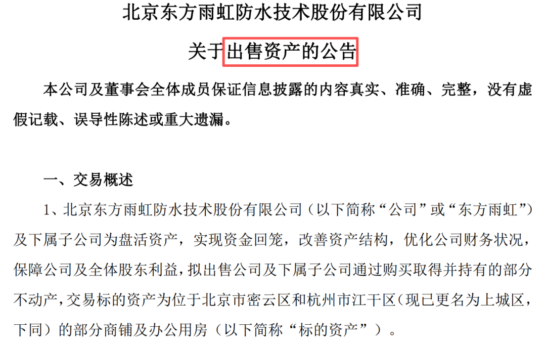 【导读】东方雨虹"亏本"出售北京及杭州物业,近期持续抛售资产 11月12日晚,东方雨虹(002271)公告,拟出售公司及下属子公司通过购买取得并持有的部分不动产,交易标的资产为位于北京市密云区和杭州市上城区 的部分商铺及办公用房。本次交易预计形成资产处置损失2580.85万元,达到公司最近一个会计年度经审计净利润的10%以上。 | | | | 成长能力指标 | 24-12-31 | 23-12-31 | 22-12-31 | 21-12-31 | | --- | --- | --- | --- | --- | | 营业总收入(元) | 280.6亿 | 328. 2亿 | 312. 1亿 | 319. 3亿 | | 毛利润(元) | 72.38亿 | 90.88亿 | 80. 42亿 | 97.50亿 | | 归属净利润(元) | 1.082亿 | 22.73亿 | 21.21亿 | 42.05亿 | | 扣非净利润(元) | 1.236亿 | 18.41亿 | 18.04亿 | 38.67 7. | | 营业总收入同比增长(%) | -14. 52 | 5.15 | -2. 26 | 46. 96 | | ...