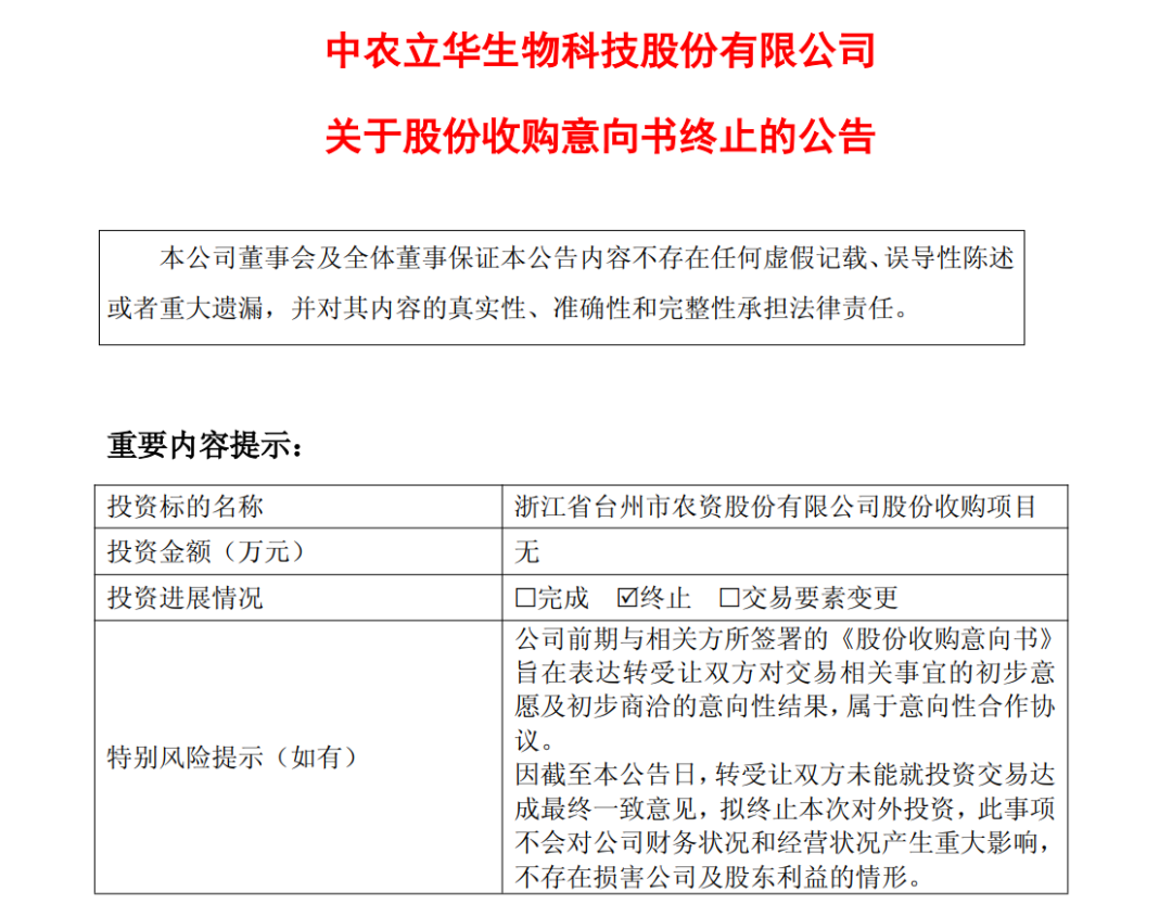 历时半年,中农立华的收购事项宣告终止。 中农立华终止收购台州农资50%股份 11月17日,中农立华发布公告称,公司与浙江省台州市农资股份有限公司(以下简称台州农资)的7位自然人股东陶维康、金果夫、刘海布、王伟民、胡 精良、黄伟胜、江志坚曾于5月20日签署《股份收购意向书》,拟以现金方式或其他方式收购上述自然人股东持有的台州农资不少于50%股份。 中农立华表示,《股份收购意向书》签署后,双方依照协议规定积极推动相关工作的实施。在尽职调查和资产评估的基础上,公司与陶维康先生等自然人 股东就本次交易涉及的相关事项进行了多次讨论协商,但现阶段双方未能就本次交易的部分核心条款达成最终一致意见。 为保障双方的权益,经公司与陶维康等自然人股东协商一致,同意《股份收购意向书》终止。 前三季度净利润下滑 据悉,中农立华主要从事农药流通与植保技术服务,以销售农药原药、制剂及相关产品为主,同时面向种植户提供作物健康解决方案,开展植保产品的使 用技术指导、应用示范以及产品的分装加工等服务。 台州农资致力于为农业客户提供高质量的产品,并通过技物结合的服务模式服务客户。业务模式主要为连锁配送、代理分销、大农户直销(家庭农场)等 多业态兼 ...