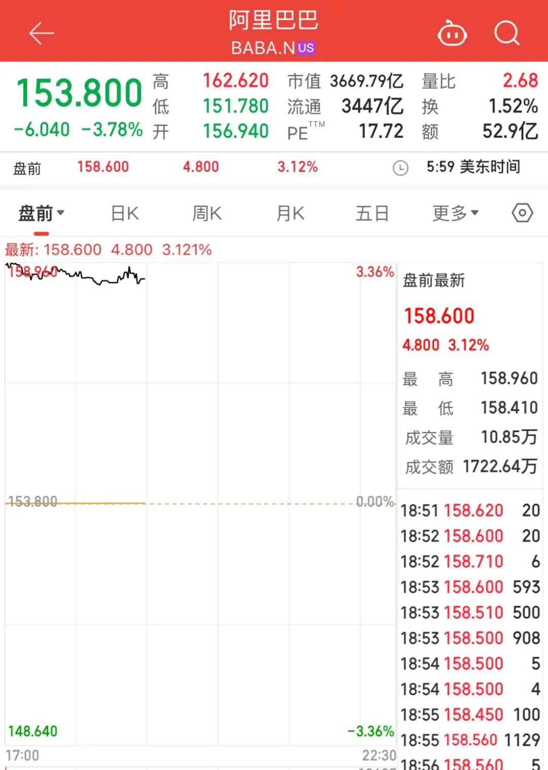 【导读】阿里千问App上线公测,阿里巴巴美股盘前拉升 一则利好,或引爆股价! 11月17日,阿里巴巴正式宣布"千问"项目,全力进军AI to C市场。与此同时,千问App公测版上线。 截至发稿,阿里巴巴美股盘前涨超3%,报158.60美元/股。 | 阿里巴巴 | | | | --- | --- | --- | | BABA.Nus | | | | 153.800 幅 162.620 市值 36.79亿 肇比 | | 2.68 | | 流通 3447亿 换 | 151.780 | 1.52% | | -6.040 -3.78% 开 156.940 | | PE™ 17.72 额 52.9 亿 | | 盘前 158.600 4.800 3.12% | | (2 5:59 美东时间 | | 盘前 ▼ 日K 月K 周K | | 五日 更多▼ (o) | | 最新: 158.600 4.800 3.121% | | | | 198,960mm Ma | | 3.36% 盘前最新 | | | | 158.600 | | | | 4.800 3.12% 最 高 158.960 | | | | 158.410 最 低 | | ...