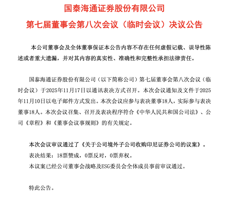 (原标题:头部券商,加速"出海"!) 【导读】国泰海通境外子公司拟收购印尼证券公司 中国基金报记者 孙越 头部券商国际化布局再落一子! 11月17日,国泰海通证券发布公告称,公司第七届董事会第八次会议(临时会议)审议通过了一项重要 议案——其境外子公司将收购一家印尼证券公司。 此前,国泰海通证券已在东南亚设立新加坡子公司、越南子公司等境外子公司,持续拓展区域业务。此 次收购若顺利落地,将标志着其在东南亚的布局再进一步。 近年来,国泰海通证券在海外布局取得积极进展,主要聚焦东南亚、美国、欧洲等市场,通过子公司增 资、业务牌照获取、跨境服务拓展等方式推进国际化战略。2024年,其越南子公司增资获得越南证监会 批复;英国子公司实现了E-FICC大类资产全覆盖。 国泰海通证券在2024年年报中展望2025年全年重点任务时,其中一项就是"推进国际化战略,优化跨境 一体化管理机制和发展模式,持续深耕重点区域市场,加强在'一带一路'国家的布局,全面提升公司业 务、人员和运营的国际化水平"。 随着中国资本市场双向开放不断深化,国际化已成为中资券商共同的发展方向。从区域布局来看,中小 券商多聚焦香港市场,而头部券商则倾向于在核 ...