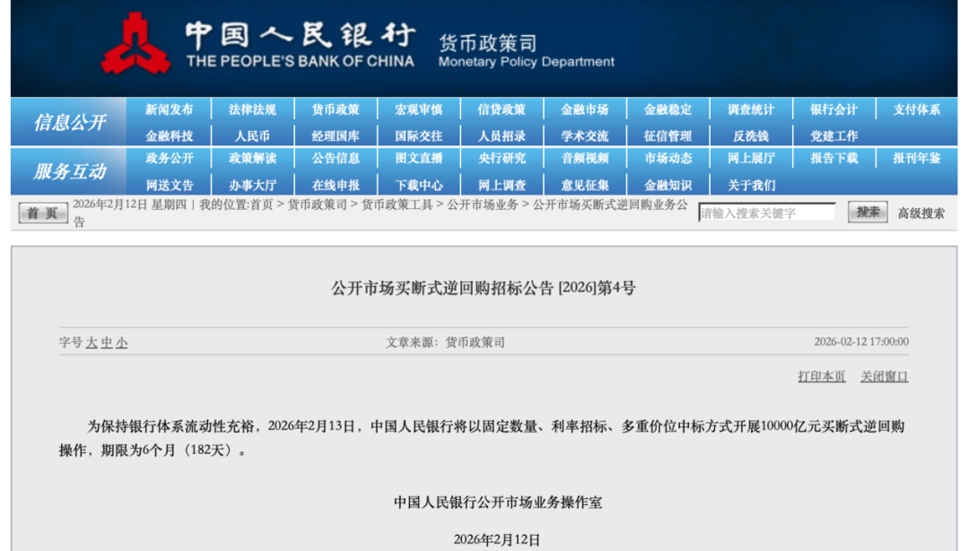 【导读】央行将开展10000亿元买断式逆回购操作 中国基金报记者 张玲 2月12日,央行发布消息称,为 保持银行体系流动性充裕,2026年2月13日,中国人民银行将以固定数量、利率招标、多重价位中标方 式开展10000亿元买断式逆回购操作,期限为6个月(182天)。 数据显示,2月有5000亿元6个月期买断 式逆回购到期。由此,央行2月13日开展10000亿元买断式逆回购操作,意味着当月6个月期买断式逆回 购为加量续作,加量规模为5000亿元,为6个月期买断式逆回购连续第六个月加量续作,加量规模较上 月增加2000亿元。 综合来看,2月两个期限品种的买断式逆回购合计净投放6000亿元,净投放规模较上 月增加3000亿元,为央行连续第九个月通过买断式逆回购向市场注入中期流动性。 "从操作量看,本次 操作加量续作5000亿元,超过预期。本月央行买断式逆回购累计净投放6000亿元,为近三个月来最 高。"招联首席经济学家、上海金融与发展实验室副主任董希淼指出。 他分析称,2月仍然是银行信贷 投放较为集中的月份,叠加春节之前取现增多等因素影响,市场对流动性需求有所增加。央行在节前大 动作超量续作买断式逆回购,传递出保持 ...