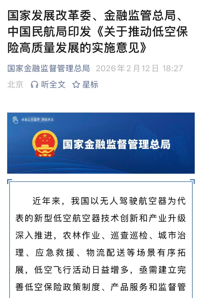 Core Viewpoint - The implementation opinion on promoting the high-quality development of low-altitude insurance has been released, emphasizing the importance of establishing a comprehensive low-altitude insurance system to support the safety and healthy development of the low-altitude economy [1][5]. Summary by Sections 1. Importance of Low-Altitude Insurance - Low-altitude insurance is crucial for ensuring the safety of low-altitude flight activities, providing risk protection for the manufacturing and operation of low-altitude aircraft, infrastructure construction, and various specialized services [4][10]. 2. Development Goals - By 2027, a preliminary mandatory insurance system for unmanned aerial vehicle (UAV) liability insurance will be established, with a continuous enrichment of low-altitude insurance products to meet diverse application scenarios [5][10]. - By 2030, a basic policy framework for low-altitude insurance will be formed, enhancing its role in ensuring the safety and health of the low-altitude economy [5][10]. 3. Policy Framework - The implementation opinion calls for integrating insurance into the overall planning and regulatory framework for low-altitude economic development, promoting the establishment of relevant laws and regulations [11]. - It encourages local governments to incorporate insurance into their low-altitude economic policies and to develop supportive measures tailored to local conditions [11]. 4. Insurance Mechanisms - The document advocates for the use of insurance mechanisms to enhance risk management within the low-altitude economy, particularly for manufacturers and operators of low-altitude aircraft [12]. - It emphasizes the need for major enterprises in the low-altitude industry chain to collaborate through insurance to reduce risk costs across the supply chain [8][12]. 5. Technological Integration - There is a push to utilize emerging technologies to facilitate convenient and intelligent online operations for insurance related to micro, light, and small UAVs [8][13]. - The establishment of a low-altitude insurance information platform is highlighted, aiming to integrate with low-altitude intelligent network systems for better data sharing and risk management [6][14]. 6. Service Optimization - The opinion stresses the importance of developing a comprehensive insurance product system covering the entire low-altitude industry chain, including research, manufacturing, and operational aspects [13]. - It aims to provide targeted insurance protection based on various application scenarios such as agriculture, logistics, and emergency management [13]. 7. Capacity Building - The document calls for enhancing the professional capabilities of insurance institutions to better identify and assess new risks associated with low-altitude operations [14]. - It encourages the cultivation of specialized talent within the insurance sector to improve risk assessment and product development [14]. 8. Organizational Coordination - A coordinated approach among relevant government departments is necessary to implement the low-altitude insurance initiatives effectively [16]. - The establishment of a regular communication mechanism is proposed to address challenges encountered during the promotion of low-altitude insurance [16].