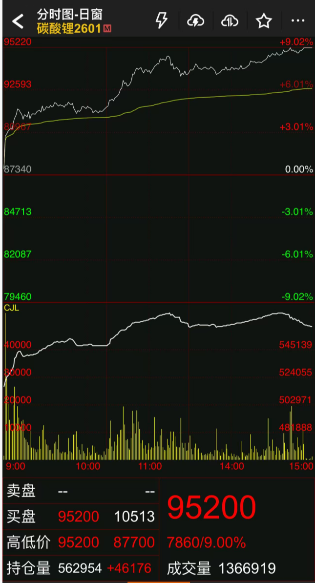 【导读】A股震荡,锂矿概念集体暴涨 大家好,今天市场走势较为震荡,一起看看发生了什么事情。 碳酸锂期货涨停 11月17日,碳酸锂期货主力合约触及涨停,涨幅达9%,报95200元/吨,创2024年7月以来新高。 | 大介理业 | 62.20 +9.87% 7.02亿 | | +5. | | --- | --- | --- | --- | | sz 002466 成交活跃 | | | | | 西藏城投 | 14.25 | +9.62% 1.24亿 | +1. | | SH 600773 60日新高 | | | | | 永兴材料 | | 56.28 +8.86% -1.12亿 | +4. | | sz 002756 60日新高 | | | | | 赣锋锂业 | 74.04 | +7.48% 7.18亿 | +5 | | sz 002460 实时热搜 | | | | | 江特电机 | 12.35 | +6.93% 1.92亿 | +0. | | sz 002176 60日新高 | | | | | 永杉锂业 | 11.95 | +6.32% 3454.96万 | +0 | | SH 603399 60日新高 | | | ...