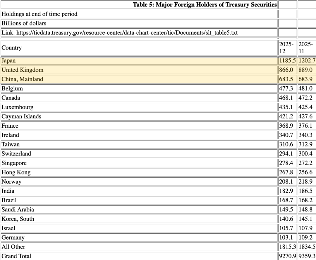 | | Table 5: Major Foreign Holders of Treasury Securities | | | --- | --- | --- | | Holdings at end of time period | | | | Billions of dollars | | | | Link: https://ticdata.treasury.gov/resource-center/data-chart-center/tic/Documents/slt_table5.txt | | | | Country | 2025- | 2025- | | | 12 | 11 | | Japan | | 1185.5 1202.7 | | United Kingdom | 866.0 | 889.0 | | China, Mainland | 683.5 | 683.9 | | Belgium | 477.3 | 481.0 | | Canada | 468.1 | 472.2 | | Luxembourg | 435.1 | 425.4 | | Cayman Islands | 421.2 | 427 ...