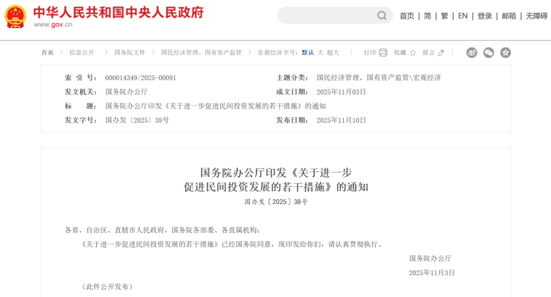 【导读】国务院办公厅印发《关于进一步促进民间投资发展的若干措施》 盘后又有大利好! 11月10日,中国政府网显示,国务院办公厅印发《关于进一步促进民间投资发展的若干措施》(以下简称《若干措施》),提出13项针对性政策举措,意 在进一步激发民间投资活力、促进民间投资发展。 扩大准入方面,《若干措施》提出,对需报国家审批(核准)的具有一定收益的铁路、核电等重点领域项目,鼓励支持民间资本参与并明确持股比例等要 求;对具备条件的项目,民间资本持股比例可在10%以上。 《若干措施》要求,对各地方规模较小、具有盈利空间的城市基础设施领域新建项目,鼓励民间资本参与建设运营。引导民间资本有序参与低空经济领域 基础设施建设,积极支持有能力的民营企业牵头承担国家重大技术攻关任务。 《若干措施》提到,清理不合理的服务业经营主体准入限制;规范实施政府和社会资本合作新机制,修订分类支持民营企业参与的特许经营项目清单;坚 决取消招标投标领域对民营企业单独设置的不合理要求。进一步加大政府采购支持中小企业力度。 打通堵点方面,《若干措施》要求,保障民营企业在电力并网运行、油气管网设施使用、运力资源调配等方面的合法权益;鼓励支持民营企业加快建 ...