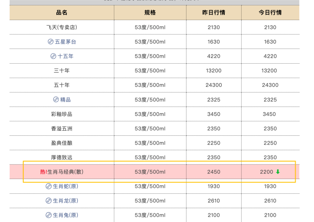【导读】马茅价格今日每瓶暴跌250元 春节临近,马茅价格再次跳水! 2月10日,基金君发现,i茅台马茅销售依旧火热,不到5分钟的时间,珍享版便显示"已售罄",经典版、礼盒装也相继售罄。 基金君所在的一个微信群中,也有不少群友表示"抢不到",还有称系统"压根进不去"。 | 品名 | 规格 | 昨日行情 | 今日行情 | | --- | --- | --- | --- | | 飞天(专卖店) | 53度/500ml | 2130 | 2130 | | 2 五星茅台 | 53度/500ml | 1630 | 1630 | | で十五年 | 53度/500ml | 4220 | 4220 | | 三十年 | 53度/500ml | 13200 | 13200 | | 五十年 | 53度/500ml | 24300 | 24300 | | の精品 | 53度/500ml | 2325 | 2325 | | 彩釉珍品 | 53度/500ml | 3450 | 3450 | | 香溢五洲 | 53度/500ml | 2350 | 2350 | | 盈典佳酿 | 53度/500ml | 2250 | 2250 | | 厚德致 ...