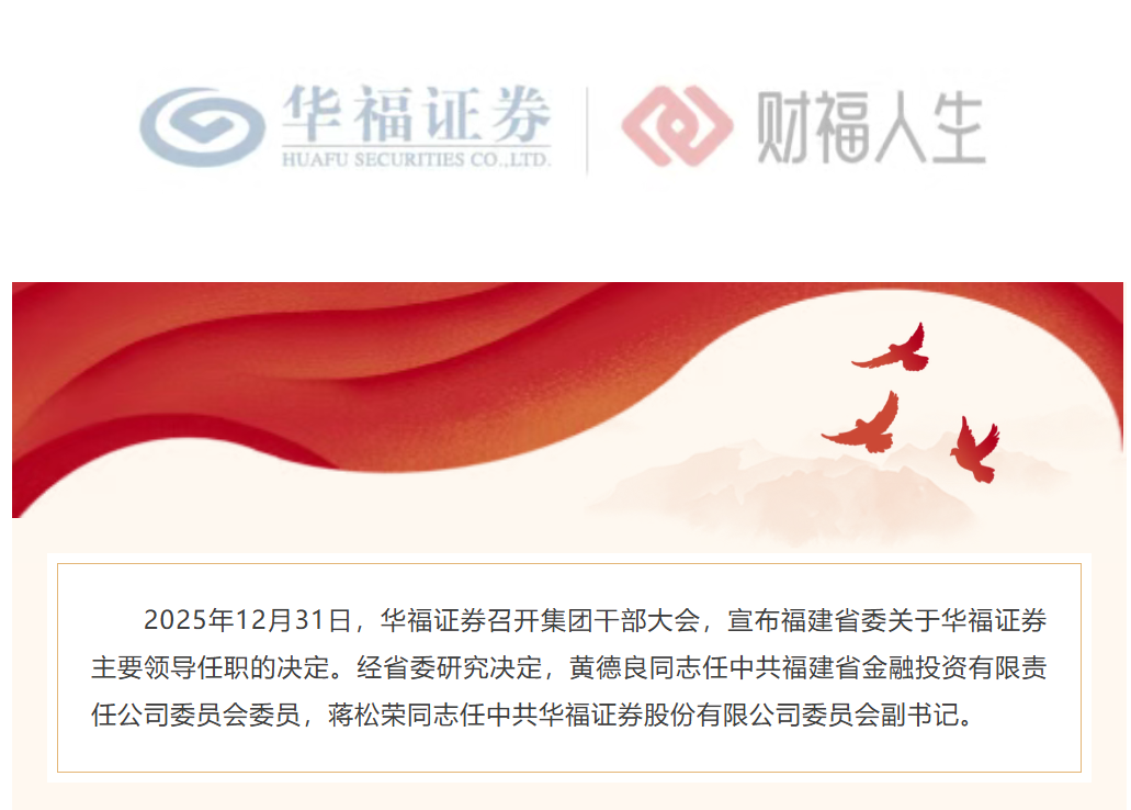 2025年最后一天,华福证券核心管理层重大调整,新总裁人选落定!华福证券党委书记、董事长黄德良将兼任股东单位福建金投的党委委员,同 时拟兼任福建金投副总经理;公司党委委员、副总裁蒋松荣拟提名为华福证券总裁候选人。 【导读】华福证券新总裁定了,董事长黄德良拟兼任股东单位福建金投副总,副总裁蒋松荣拟提名为总裁候选人 中国基金报记者刘明 据了解,按照惯例,黄德良还将拟兼任福建金投副总经理,蒋松荣也拟提名为华福证券总裁候选人,相关事项预计将在履行公司治理程序后正式 发布。 公开信息显示,黄德良,1973年出生,在银行、信托、证券等多元金融领域深耕近30年。历任兴业银行股份有限公司重庆分行行长助理、重庆分 行党委委员,兴业国际信托有限公司党委委员、副总裁,华福证券有限责任公司党委副书记、董事、总裁等职。黄德良自2014年起任职华福证券 总裁,2025年7月起任华福证券党委书记、董事长兼总裁。 新总裁蒋松荣同样是一位深耕金融市场的"老将",其在银行、信托、期货、资管、证券等多个领域任职长达23年。蒋松荣2015年8月调任华福证 券,在华福证券任职也已超10年。 2025年6月,华福证券党委书记、董事长苏军良转任兴业证券党 ...