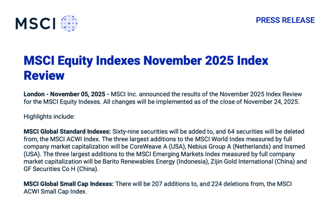 【导读】MSCI发布最新调整结果 中国基金报记者 忆山 当地时间11月5日,国际指数编制公司MSCI发布11月指数调整结果,所有调整将于2025年11月24日收盘 后实施。 紫金黄金国际、广发证券被纳入MSCI新兴市场指数 具体来看,MSCI全球标准指数系列中,MSCI全球指数将新增69只证券,并剔除64只证券。 按总市值计算,MSCI全球指数新增的最大3只证券为美国CoreWeave A、荷兰Nebius Group A、美国 Insmed。MSCI新兴市场指数新增的最大3只证券为印度尼西亚Barito Renewables Energy、中国紫金黄金 国际、中国广发证券H股。 MSCI全球小盘股指数将新增207只证券,剔除224只证券;MSCI全球可投资市场指数将新增199只证 券,剔除211只证券;MSCI全球全市场指数将新增175只证券,剔除71只证券。 MSCI中国A股指数系列方面,将新增千里科技、东阳光、长川科技、华虹公司等17只证券,剔除东阿 阿胶、海澜之家、南京证券等16只证券。 MSCI前沿市场指数将新增8只证券,剔除2只证券。按公司总市值计算,该指数新增的最大3只证券为越 南航空股份公司、 ...