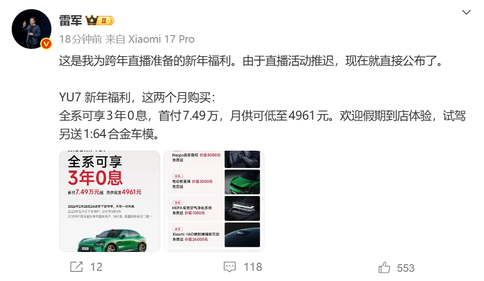 Group 1 - Xiaomi announced a New Year promotion for its YU7 model, offering a 3-year interest-free financing option with a down payment of ¥74,900 and monthly payments starting at ¥4,961 [1][3] - Customers who place an order by February 28, 2026, can enjoy up to ¥48,000 in purchase benefits, including features like Nappa leather seats and advanced air purification systems [3] - The interest-free financing is equivalent to a subsidy of approximately ¥19,125 for the YU7 Max model, enhancing the perceived value for customers [4] Group 2 - Xiaomi's YU7 model has achieved significant sales milestones, ranking first in the SUV category for four consecutive months as of November 2025 [9] - In the third quarter of 2025, Xiaomi reported a revenue of ¥1,131.2 billion, a year-on-year increase of 22.3%, with the smart electric vehicle segment generating ¥283 billion [9] - The company has expanded its retail presence, with 477 stores across 138 cities by the end of December 2025, and plans to open additional locations in January 2026 [10]