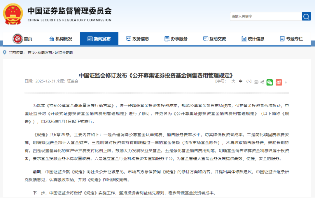 【导读】证监会正式发布《公开募集证券投资基金销售费用管理规定》 中国基金报公募基金报道组 公募基金行业费率改革,今日迎来里程碑式收官! 2025年12月31日,《公开募集证券投资基金销售费用管理规定》(以下简称《规定》)重磅修订并正式发布,自2026年1月1日起实施。 业内人士表示,此次公募基金销售费率改革方案的出台,作为费率改革的最后一步,标志着我国公募基金行业费率改革平稳落地,这不仅是对十余年前规 定的全面升级,更是贯彻新"国九条"、推动公募基金行业高质量发展的关键落子。 公募基金销售费用新规发布 明日正式实施 《规定》着重解决过往基金行业中存在的认申购费率水平相对偏高、赎回费收取机制设计复杂、销售服务费缺乏有效规制等突出问题,共有6章29条,主 要包括以下方面: 一是合理调降公募基金认申购费、销售服务费率水平。将主动偏股型基金、其他类型的混合型基金、指数型基金和债券型基金的认申购费率上限分别调降 至0.8%、0.5%、0.3%、0.3%。 二是简化赎回费收费安排,明确赎回费全部计入基金财产。 《规定》明确,将现行四档赎回费率安排简化成三档,并要求全部计入基金财产;同时,将持有期超过7日(含)但少于30日 ...