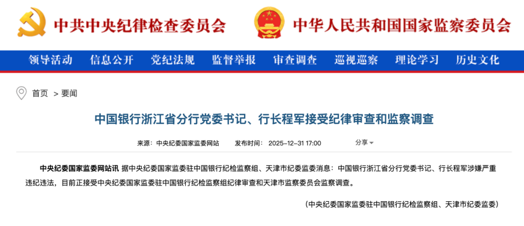 【导读】中国银行浙江省分行党委书记、行长程军接受纪律审查和监察调查 程军在中国银行系统任职多年,曾任中国银行总行国际结算部总经理,中国银行总行贸易金融部总经理,中国银行约翰内斯堡分行行长,中国银行新加坡 分行行长等职务。2024年,任中国银行浙江省分行党委书记;同年7月,任中国银行浙江省分行行长。 (文章来源:中国基金报) 近期,程军还曾在相关活动中公开亮相。12月18日,中国民营经济国际合作商会发布消息称,当日下午,中国银行浙江省分行行长程军等人在该商会常务 会长单位桐昆调研。另有媒体报道称,12月23日,程军等人在杭钢集团开展工作交流。 公开资料显示,程军,中共党员,高级经济师,拥有中国人民大学与英国曼彻斯特大学经济学双硕士学位,英国皇家特许银行学会会士。 12月31日,中央纪委国家监委网站发布消息称,据中央纪委国家监委驻中国银行纪检监察组、天津市纪委监委消息:中国银行浙江省分行党委书记、行长 程军涉嫌严重违纪违法,目前正接受中央纪委国家监委驻中国银行纪检监察组纪律审查和天津市监察委员会监察调查。 ...