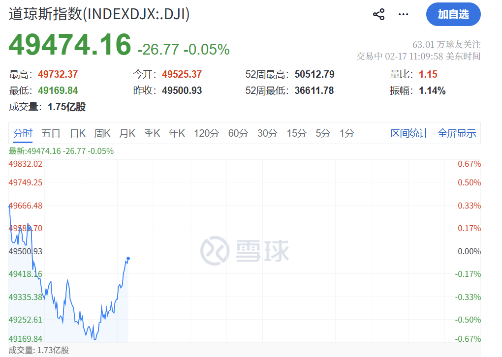 大家好,今天是周三,一起聚焦海外市场最新收盘表现与最新资讯。 美东时间2月18日周二收盘,美国股市集体收涨,大型科技股、中概股涨跌互现。 截至收盘,道琼斯工业平均指数涨0.07%,报49533.19点;标普500指数涨0.1%,报6843.22点;纳斯达 克综合指数涨0.14%,报22578.38点。 | 板块方面,昨夜今晨美股大型科技股涨跌不一,万得美国科技七巨头指数涨0.53%。 | | --- | | 序号 | 代码 | 名称 | 现价 | 涨跌 | 涨跌幅 ▼ | 总市值1 | | --- | --- | --- | --- | --- | --- | --- | | 1 | AAPL | 苹果(APPLE) | 264.000 | 8.220 | 3.21% | 38741亿 | | 2 | AMZN | 亚马逊(AMAZON) | 201.270 | 2.480 | 1.25% | 21593亿 | | 3 | NVDA | 英伟达(NVIDIA) | 185.090 | 2.280 | 1.25% | 44948亿 | | 4 | META | 脸书(META PLATFOl | 639.690 ...