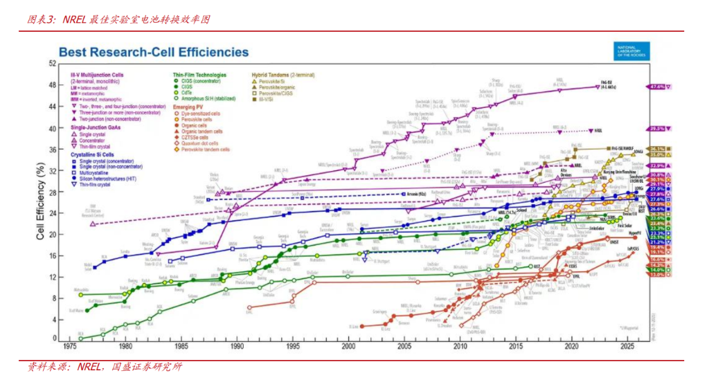 此外,成本曲线正在快速下探。当前钙钛矿组件单位生产成本约1.2元/W,虽高于晶硅组件,但随着设备国产化、产能利用率提升及材料工艺优 化,预计2026年成本可降至1.0元/W,逼近晶硅电池水平。 随着晶硅电池效率逼近理论极限,钙钛矿正在成为光伏市场的下一个破局者。 国盛证券分析师杨润思在最新报告中明确,2025年是钙钛矿GW级量产元年,随着仁烁光能、杭州柯林、中核光电等GW级产线陆续落地,未来 两年将进入产能爆发期。国盛证券预计,2027年全球产能超5GW,2030年突破30GW。 产业迭代正在发生。目前国内单结钙钛矿实验室效率已达27.3%,叠层电池更是突破35.0%,全面碾压晶硅电池27.9%的极限。更关键的是,核心 设备已实现100%国产化,稳定性通过IEC商用认证。 这意味着光伏赛道的逻辑正在从"产能过剩的存量博弈"转向"技术迭代的增量爆发"。赢家主要集中在三条主线:具备整线交付能力的设备龙头、 核心材料供应商以及拥有叠层技术优势的组件大厂。 技术奇点:效率碾压晶硅,稳定性不再是拦路虎 光伏的核心逻辑永远是效率。晶硅技术已触碰天花板,而钙钛矿正在打开新的空间。 效率断层领先: 单结钙钛矿实验室最高效率达 ...