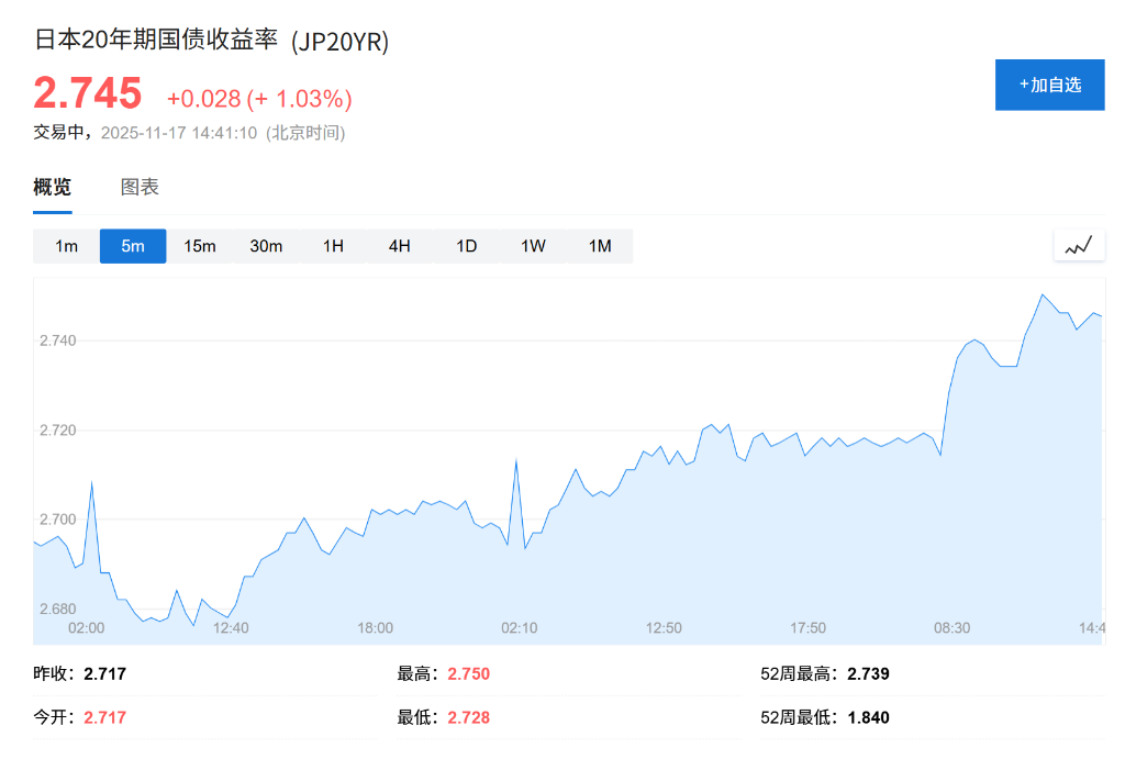 财政扩张担忧引发日本长债猛烈抛售,20年期收益率飙升至1999年来新高