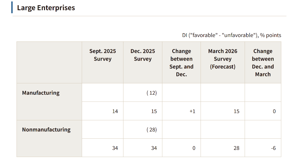 日本大型制造业企业的商业信心在12月攀升至四年来的最高水平,显示出该国企业在面对外部不确定性时仍保持韧性。这一关键数据的出炉,进 一步巩固了市场对于日本央行将在本周会议上加息的预期,表明实现货币政策正常化的进程并未受到阻碍。 12 月 15 日周一,据日本央行公布的季度短观调查报告显示,大型制造业景气指数从9月的14升至本月的15,符合经济学家的中值预期,且为连续 第三个季度改善。与此同时,隔夜掉期市场的定价显示,交易员们认为日本央行在周五结束的为期两天的会议上将基准利率上调至0.75%的可能 性高达95%。彭博调查的50位观察人士也一致预计央行将加息25个基点。 | | Sept. 2025 Survey | | Dec. 2025 Survey | | Change between Sept. and | | March 2026 Survey (Forecast) | | Change between Dec. and | | | --- | --- | --- | --- | --- | --- | --- | --- | --- | --- | --- | | | | | | | Dec. | | ...