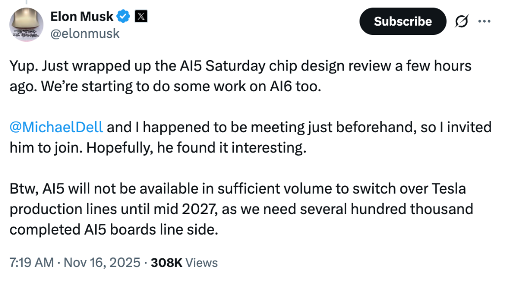 在最新社交媒体动态中,马斯克透露,其团队已于周六完成AI5芯片的设计评审,并已同步启动AI6芯片的早期研发工作。他强调,AI5是专为特 斯拉AI软件定制的推理芯片,功耗降至250瓦左右,这对Optimus来说至关重要。在特定应用场景下性能将全面优于市场上任何其他芯片方案。 马斯克正加速推进其芯片自主化战略,计划在美国打造一条从印刷电路板(PCB)、扇出型面板级封装(FOPLP)到晶圆制造的完整芯片产业 链,以逐步摆脱对外部供应链的依赖。 11月16日,据媒体报道,该计划已进入实质性推进阶段。位于得克萨斯州的全新PCB中心目前已投入运营,FOPLP工厂也已启动设备安装,预计 将于2026年第三季度实现小规模量产。据华尔街见闻,此前在特斯拉年度股东大会上,马斯克明确表达了"造芯"意向。 生产设施已启动部署 马斯克的芯片产业链计划包含两个核心设施。得克萨斯州的PCB中心已开始运营,为后续生产提供基础支撑。FOPLP工厂目前处于设备安装阶 段,预计2026年第三季度开始限量生产。 SpaceX是这一战略的主要推动力。该公司计划整合卫星芯片封装流程,降低成本并实现对星链组件的完全控制。在自主产能建成前,公司从意法 半导 ...