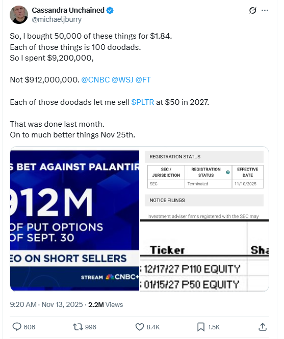 Core Viewpoint - Michael Burry, known for predicting the 2008 financial crisis, has sparked market discussions again after clarifying that his investment in shorting AI stocks is significantly lower than reported, amounting to only $9.2 million instead of $912 million as claimed by media outlets [1][2]. Group 1: Investment Actions - Burry purchased 50,000 put options for Palantir at $1.84 each, totaling an investment of $9.2 million, which corresponds to a notional value of $912 million based on the underlying stock's market value [2]. - The discrepancy in reported figures arises from the SEC's requirement for institutions to disclose options positions based on notional value rather than actual investment [2][3]. - Burry's put options allow him to sell Palantir shares at $50 each by 2027, while the current stock price is approximately $184, indicating a significant gap [2]. Group 2: Market Concerns - Burry has expressed concerns about an AI bubble, likening it to the 2000 internet bubble, and has criticized companies like Nvidia, Palantir, Meta, and Oracle for excessive capital expenditures and inflated valuations [3]. - Citron Research previously estimated Palantir's true value at $40, aligning with Burry's target price of $50 for his put options [3]. Group 3: Fund Status - Burry has officially terminated the SEC registration of his hedge fund, Scion Asset Management, and plans to liquidate the fund and return capital to investors due to disappointment with market valuations [4][10]. - The fund's registration status was terminated on November 10, and Burry hinted at a potential new direction for his investment activities, possibly outside traditional regulatory frameworks [10].