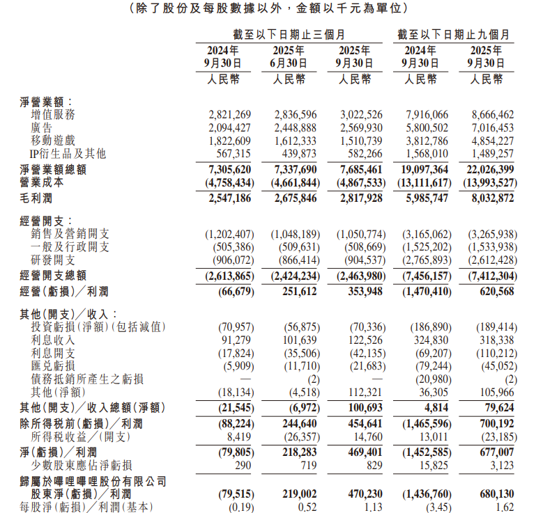 哔哩哔哩美股盘前一度涨超6%。 更多消息,持续更新中 哔哩哔哩:2025年Q3营收76.85亿元,同比增长5.2%,市场预期76.54亿元,上年同期73.06亿元;净利润4.7亿 元,市场预期2.82亿元,上年同期净亏损0.8亿元。 | | | 截至以下日期止三個月 | | 截至以下日期止九個月 | | | --- | --- | --- | --- | --- | --- | | | 2024年 | 2025年 | 2025年 | 2024年 | 2025年 | | | 9月30日 | 6月30日 | 9月30日 | 9月30日 | 9月30日 | | | 人民幣 | 人民幣 | 人民幣 | 人民幣 | 人民幣 | | :螺烯酸肤 | | | | | | | 增值服務 | 2.821.269 | 2.836.596 | 3.022.526 | 7.916.066 | 8.666.462 | | 唐告 | 2.094.427 | 2.448.888 | 2.569.930 | 5.800.502 | 7.016.453 | | 移動遊戲 | 1.822.609 | 1.612.333 | 1.510.739 ...