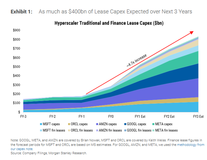 在AI驱动的算力"军备竞赛"中,科技巨头们正通过一种日益重要却又容易被忽视的方式为未来提供资金——租 赁。 据追风交易台,摩根士丹利近期发布的一份题为《AI:租赁未来》(AI: Leasing The Future)的报告显示,一 种类似债务融资的"融资租赁"模式,正在成为支撑AI基础设施扩张的关键力量。 报告指出,随着超大规模云服务商(Hyperscalers)以前所未有的速度扩张AI基础设施,它们正越来越多地采用 融资租赁来获取数据中心外壳。其预计,在未来三年的2万亿美元总资本投资中,将有高达4000亿美元(占比 20%)来源于此。 这笔庞大的表外承诺,实质上是未来的"隐形负债",将在未来数年内逐步转化为资产负债表上的使用权资产和 租赁负债。这不仅锁定了未来的资本开支,也为投资者提供了一个观察各大公司AI战略决心的窗口。 例如,报告提到甲骨文的租赁期限最长为15年,而Meta则签订了长达30年的租赁合同,反映了不同公司对未来 需求的信心和战略差异。 这种模式允许科技巨头们加速产能扩张、管理流动性并锁定未来的选择权。更值得关注的是,报告数据显示, 这些公司已披露了价值高达3880亿美元的"已签署但尚未开始" ...