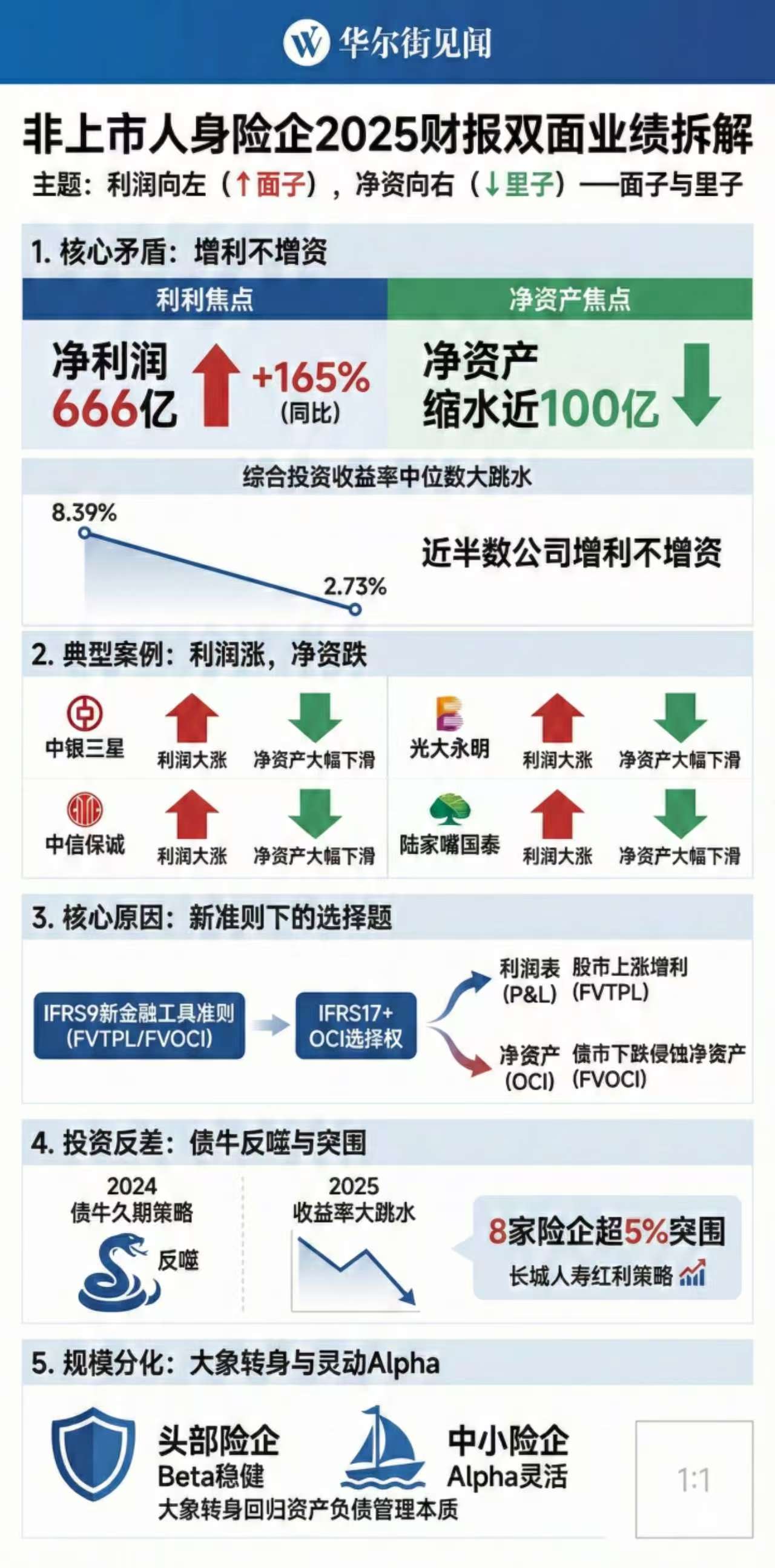 如果仅以净利润为参照系,这似乎是一个久违的丰收大年,2025年非上市险企整体净利润总额高达666亿元,较2024年的250亿元激增165%。 在经历了业绩低迷与转型阵痛后,多家头部及腰部险企的净利润创出历史新高,然而在投资人准备为新成绩举杯时,账本的"里子"却呈现了另一番景象: 2025年,非上市险企的综合投资收益率中位数遭遇了"膝盖斩",从上年的8.39%骤降至2.73%;在净利润翻倍的情况下,全行业的净资产总额反而缩水了近 100亿元。 利润在狂飙,家底却在变薄。 这是由新金融工具准则(IFRS9)与动荡的市场环境共同导演的一出大戏。 这是一个充满着"错觉"的财报季。 2025年,非上市人身险公司交出了一份颇具迷惑性的账本。 长久以来,险企的净利润与净资产往往保持着同向变动的默契,但在全面切换至新会计准则的时代,这一惯例正在被打破。 中银三星人寿便是这一现象的典型样本。 2025年,该公司实现净利润7.08亿元,同比飙升44.7%。 对于一家处于转型期的中型险企,这本是一份足以让管理层"挺直腰杆"的成绩单;然而与亮眼利润形成剧烈反差的是,其净资产却骤降至6.7亿元,同比缩 水近九成。 这并非孤例,同期光大 ...