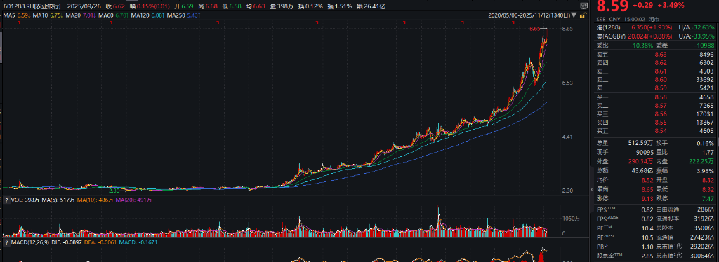 Core Viewpoint - Agricultural Bank's stock price surged over 4% on November 12, reaching a market capitalization of over 3 trillion yuan for the first time, marking a historical high. The stock has increased by 68% year-to-date and surpassed Industrial and Commercial Bank of China to become the new "universe bank" in early September [1][4]. Financial Performance - Agricultural Bank's price-to-book (PB) ratio has surpassed 1 for the first time among the four major state-owned banks, currently at 1.10, while its peers are below 0.8 [4]. - The bank's operating income grew by 2.0% year-on-year in the first three quarters of 2025, with its non-interest income growth leading among the four major banks at 31.7% [5][8]. - The bank achieved a floating profit of 8.5 billion yuan in the first three quarters, outperforming its peers, and was the only major bank to report a floating profit during the first quarter's bond market downturn [8][10]. Market Position and Strategy - Analysts suggest that Agricultural Bank's strong performance is attributed to its unique financial market operations and effective county-level financial strategies. The bank's credit expansion potential and resilient interest margins are highlighted as key strengths [4][16]. - The bank's strategy of maintaining a low proportion of TPL accounts (below 4%) has minimized its exposure to bond market fluctuations, allowing it to navigate market adjustments more effectively [10][11]. Seasonal Trends - The bank's performance aligns with historical seasonal trends, as the banking sector typically experiences a favorable period from November to January, with absolute return probabilities reaching 70%-80% [21][23]. - The bank's strong performance in the fourth quarter is expected to benefit from the traditional "opening red" phenomenon in January, where financial data is released, providing clearer insights for investors [23]. Future Outlook - Market analysts believe that Agricultural Bank's achievement of a PB ratio above 1 is indicative of a broader trend of valuation recovery among state-owned banks, supported by government policies aimed at strengthening these institutions [18][20]. - The bank's robust fundamentals, including strict non-performing loan recognition and strong provisioning, provide a solid foundation for future growth and risk management [16][17].