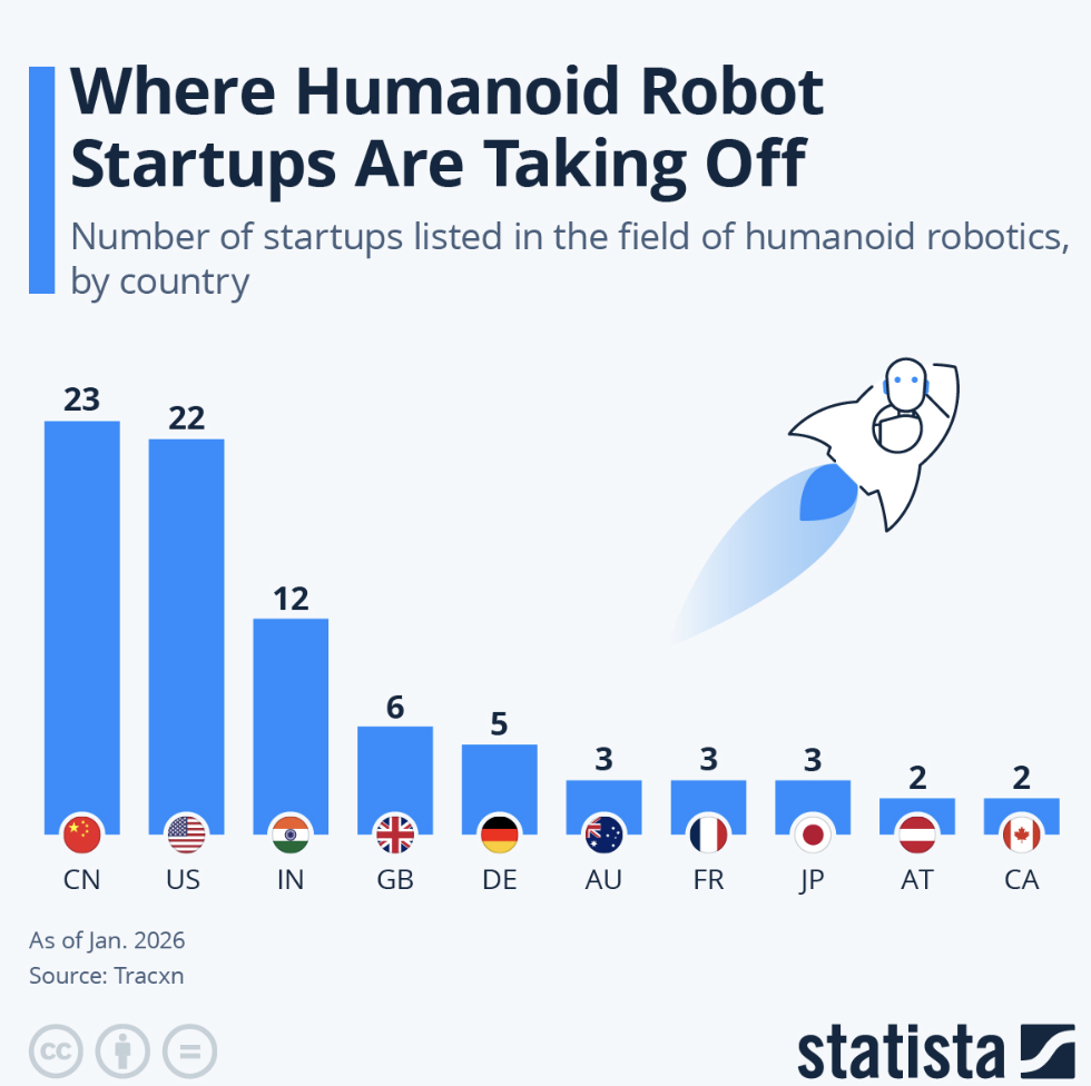 Group 1 - The humanoid robot sector is experiencing a rapid increase in capital investment, with a notable differentiation in industrialization pace, where Chinese startups are gaining an advantage over their American counterparts due to denser entrepreneurial clusters and faster output rates [1][5] - Investment in humanoid robot startups is projected to reach $2.65 billion by 2025, surpassing the total investment from 2018 to 2024, indicating a significant shift in investor confidence regarding the technology's maturity and commercial appeal [1][5] - China leads with 23 humanoid robot startups, slightly ahead of the United States with 22, while India follows with 12, showcasing a concentrated entrepreneurial ecosystem primarily in these regions [2] Group 2 - Chinese companies, such as Hangzhou Yushu Technology and Beijing Zhiyuan Robotics, are set to produce over 5,000 humanoid robots each in 2025, significantly outpacing global production rates [1][6] - In contrast, leading American firms like Boston Dynamics and Tesla plan to ramp up production of their Atlas and Optimus robots in 2026, targeting industrial and consumer applications [1][6] - European players, including Engineered Arts from the UK and Neura Robotics from Germany, are key participants but have not yet demonstrated production scales comparable to those of Chinese and American companies [6]