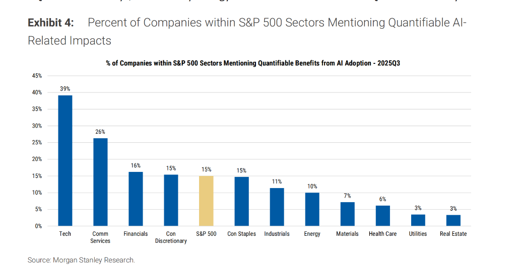 摩根士丹利在2025年11月6日发布的报告中指出,企业对人工智能(AI)的采纳正从"讲故事"阶段迈向"见实效"阶段,越来越多的公司正在获得可量化 的财务和运营收益。这一趋势不仅验证了AI的长期价值,也为投资者揭示了新的市场动态。 据追风交易台,报告指出,企业从AI中获得的"可量化"收益正稳步增长。对投资者的核心影响在于: 首先,AI带来的效率提升将支撑企业盈利扩张,预计到2026年,标普500指数的净利润率将因此增加30个基点。 其次,市场领导地位将从少数科技巨头向更广泛的"AI采纳者"扩散,为投资者提供了在科技行业之外捕捉增长的机会。 最后,尽管市场对估值泡沫感到担忧,但报告通过翔实的数据对比了当前与1999年科网泡沫时期的差异,论证了当前高估值得以维持的坚实 基本面,为投资者的长期持仓提供了信心。 AI量化效益日益凸显,应用势头不断增强 企业从AI中获得的"可量化"收益正稳步增长。通过对约7400份财报电话会议和6100份行业会议的纪要进行系统性分析,大摩发现: 这些收益主要体现在六大方面,其中"生产力提升"(如运营效率)和"财务影响"(如成本节约和营收增长)被提及最多。值得注意的是,目前企业提及 的AI ...