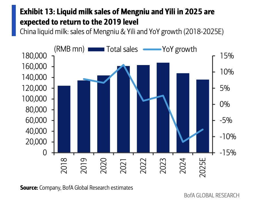 美银美林在最新报告中明确表示看好中国消费股板块,核心支撑在于三大关键变化:低基数效应打开修复窗口、估值降至历史低位、资产属性呈 现"类可转债"特征。 据追风交易台,报告指出,中国消费板块正经历投资逻辑的结构性转变。当前市场呈现出三大关键特征:一是低基数效应开始显现,多个细分行 业(如白酒、乳制品)的销售额已回落至数年前水平,为2026年业绩的同比修复提供了基础;二是估值回归历史极端低位,板块估值溢价几近消 失,主动基金配置处于冰点,逆向布局空间显现;三是资产属性转向"类可转债",龙头企业现金流稳健,高股息与回购政策构筑价格防线,兼具 防守性与未来估值修复的弹性。 该板块从过去的成长驱动转向深度价值与防御配置。投资者无需博弈短期反转,可以借助低估值与高股息构建安全垫。 理由一:低基数效应初现 报告指出,2026年多个消费细分领域将迎来同比基数的显著下降窗口。白酒行业已形成极低的市场比较基准;而在乳制品领域,国内前两大企业 的液态奶销售额经历两年深度调整后,已回落至2019年水平。 目前,消费板块12.7倍的前瞻市盈率已接近其历史均值下方两个标准差的极端低位,进入深度低估区间,并开始吸引部分逆向投资者的关注。美 ...